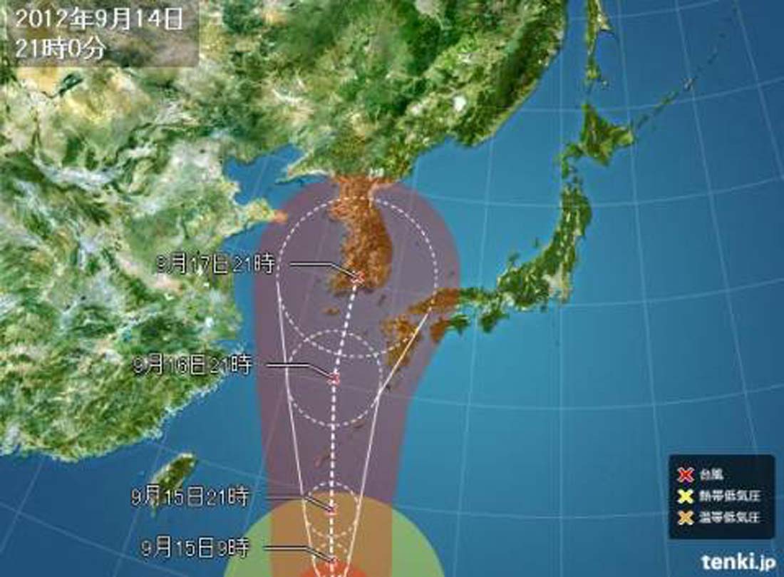 台風は、海水温の高い黒潮に沿うようなコースをたどりそうなので、台風の強い勢力を維持したまま北上する傾向が高く、気圧配置のまずさと共に、台風本体の勢力が弱まりにくいという、二つのまずさを備えているのが今回の特徴です。