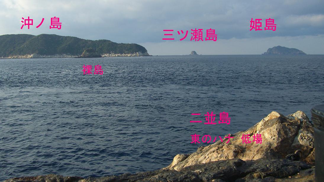 二並島の東のハナから沖ノ島本島・三ツ瀬島・姫島を望む。