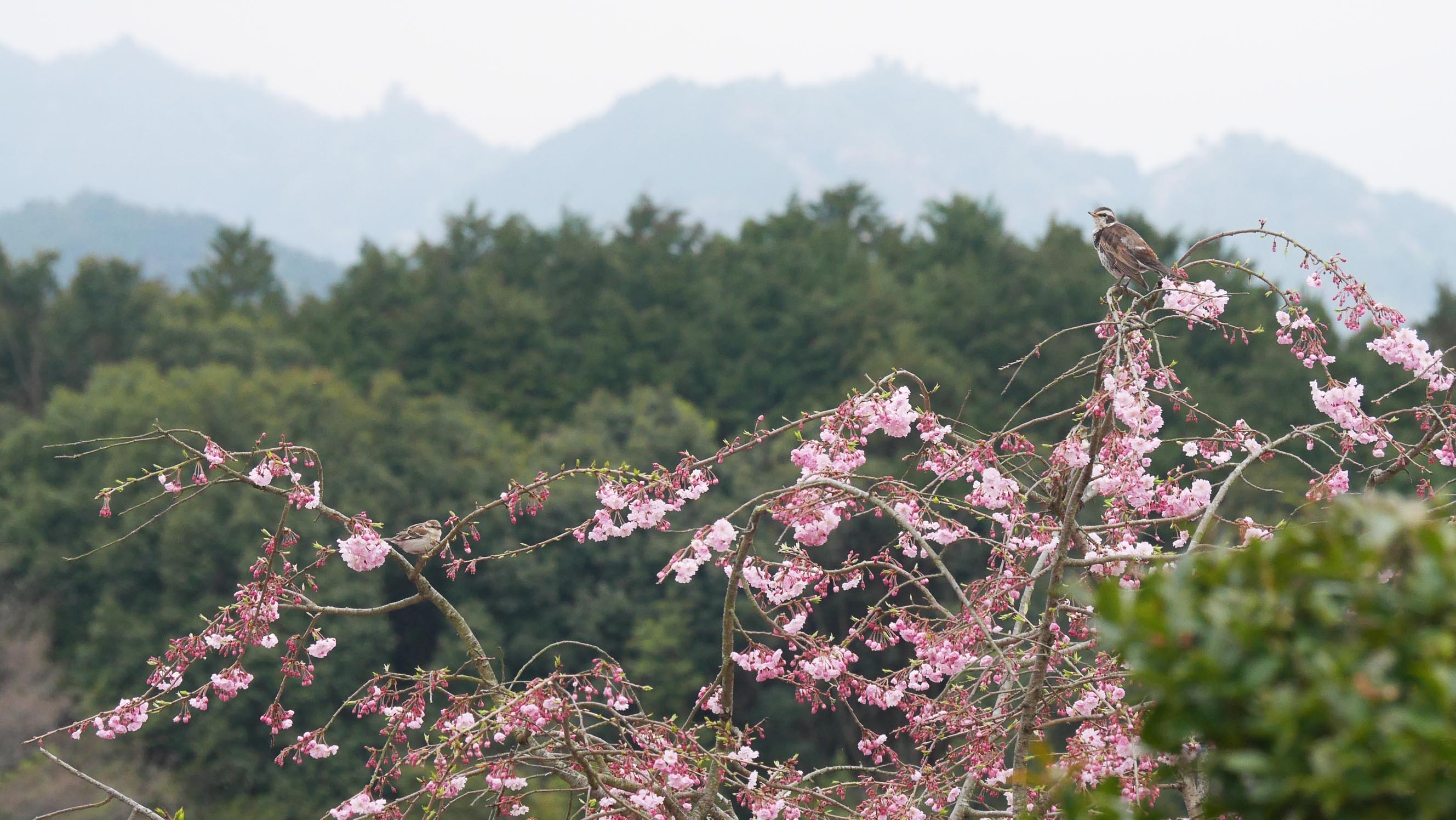 その直後、冬鳥のウソが2羽でやってきて、遅咲きの山桜の花芽を啄みはじめました。付近ではクロツグミと思われる地鳴きが度々・・・番いになったと思われます。