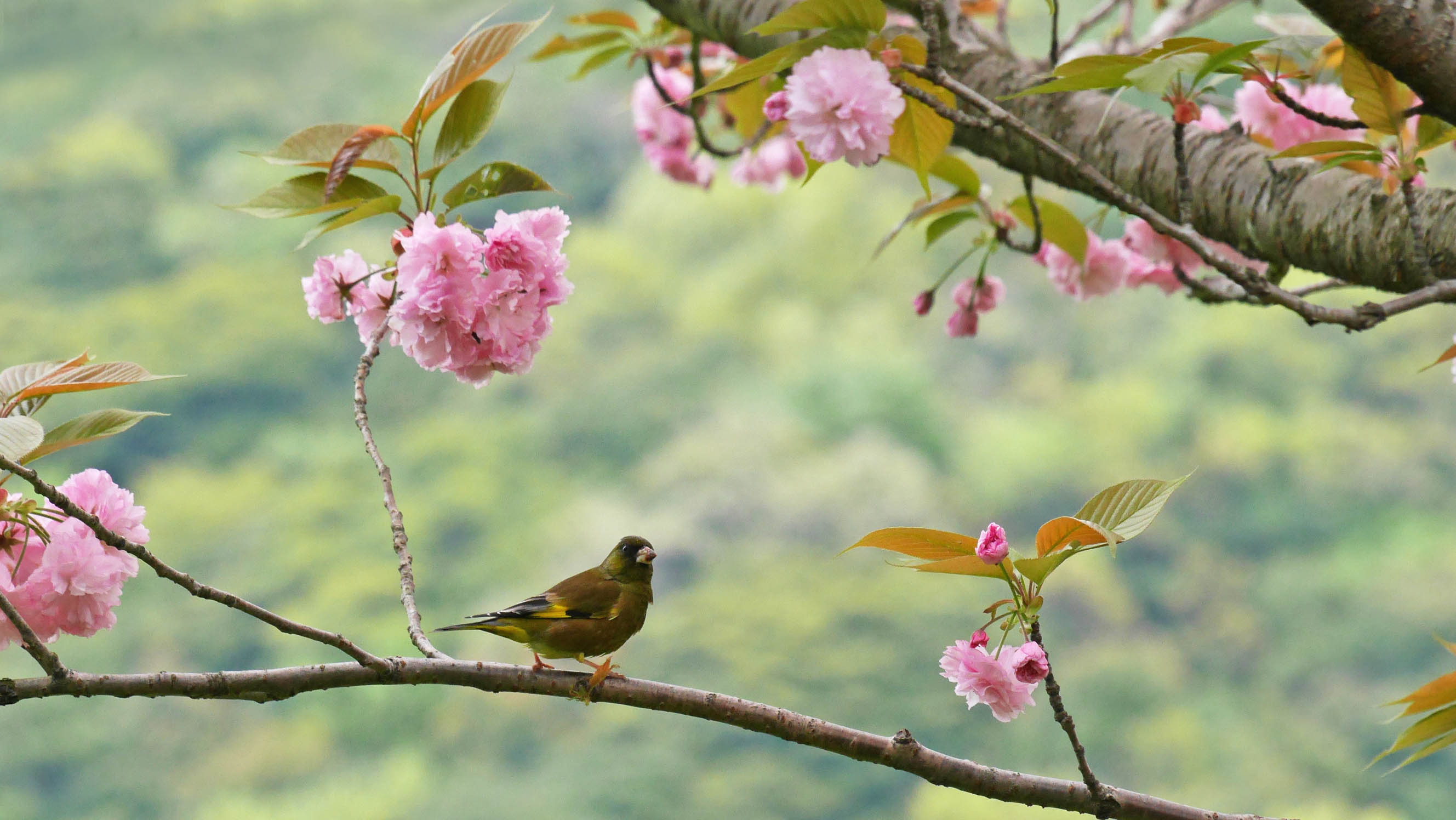 ヤマガラハウスのカワラヒワと八重桜