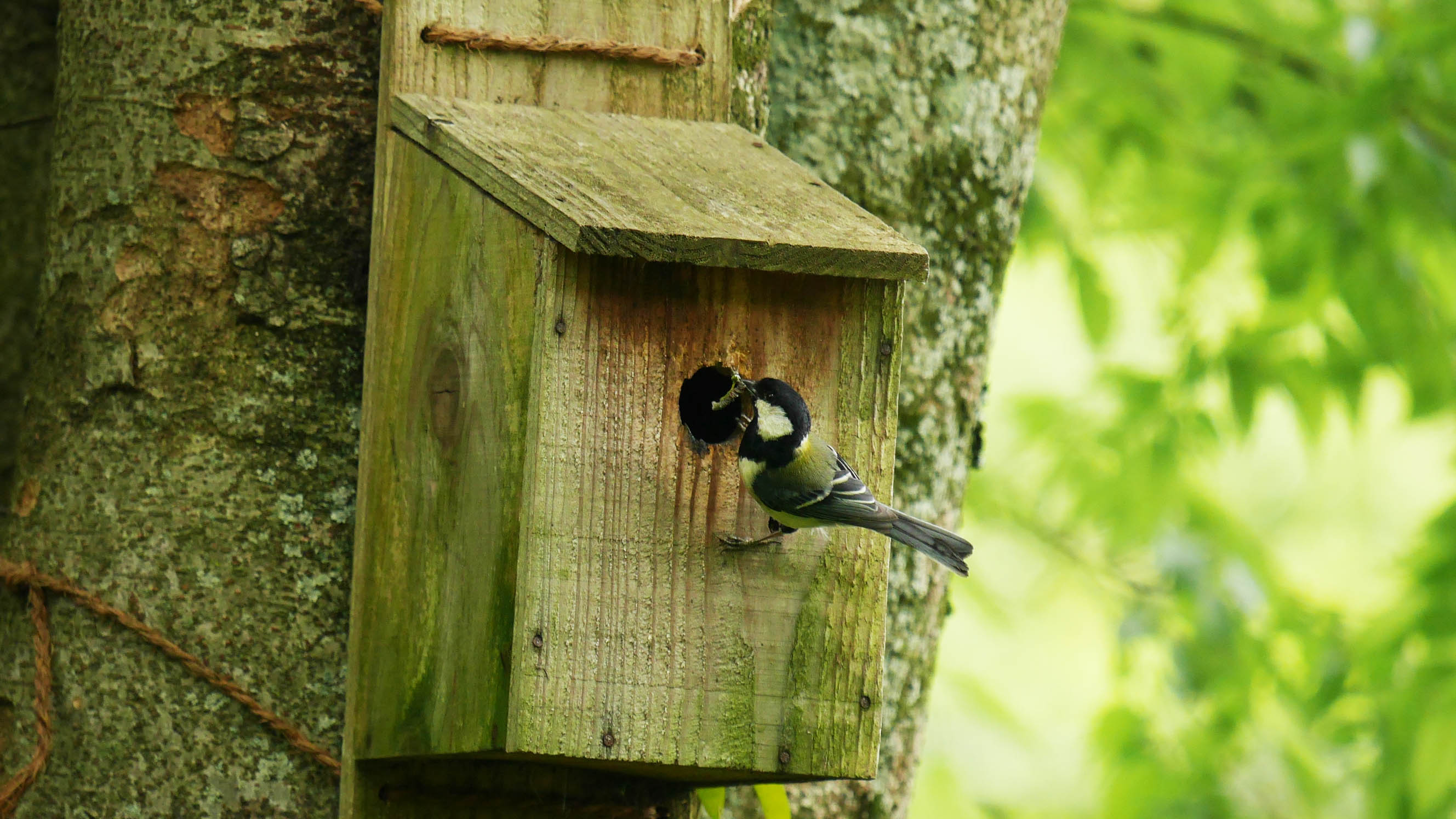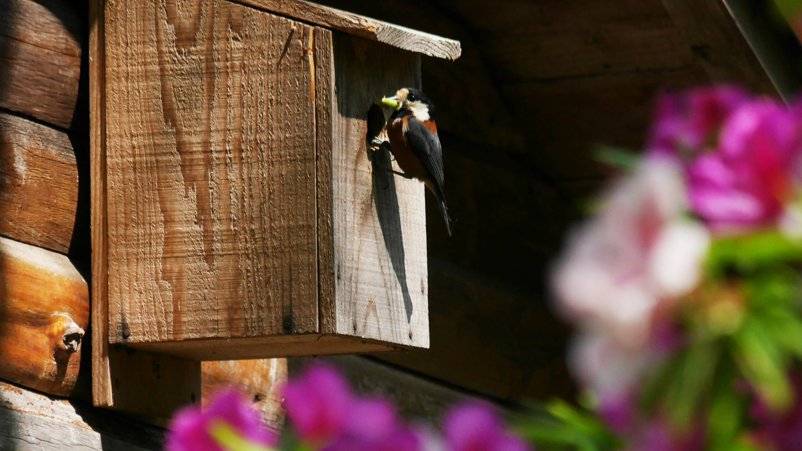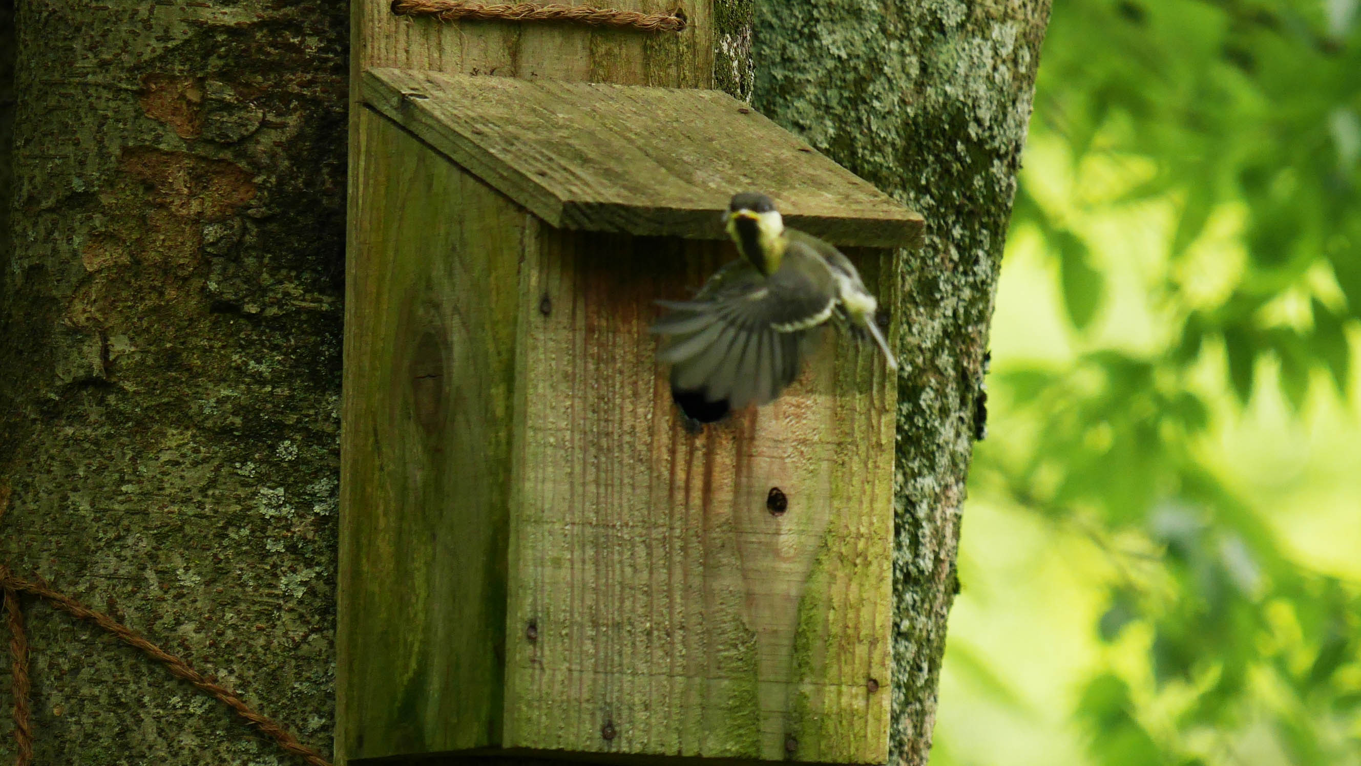 車内から静かに確認していると、お父さんがエサを咥えて来て巣箱内を覗きます。