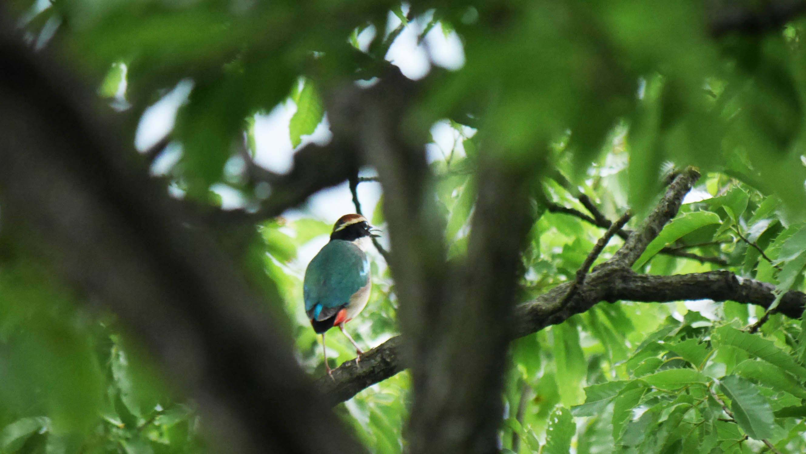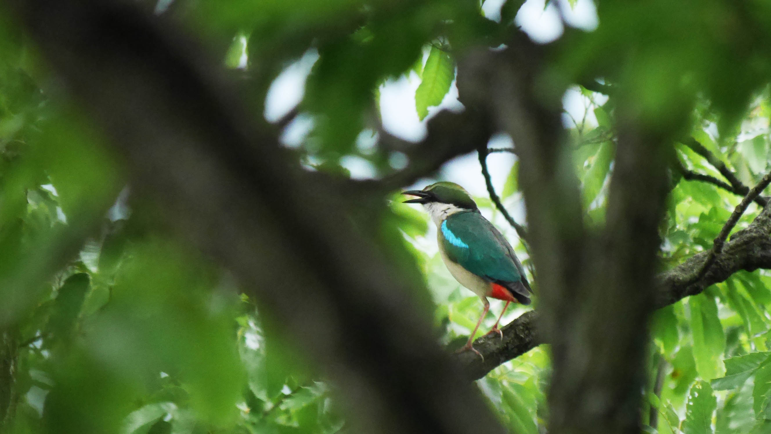 いつもの場所からアカショウビンの鳴き声が聞こえた後、昨日ヤイロチョウが鳴いた付近から今日も鳴き声が聞こえてきます。すると近くの尾根付近から、少し高い音色のヤイロチョウの声。二つの鳴き声はお互いに鳴き合いながら、低い声のオスと思われる個体が高い音色のヤイロチョウの場所へと移動して、同じ場所で暫く鳴き合いました。