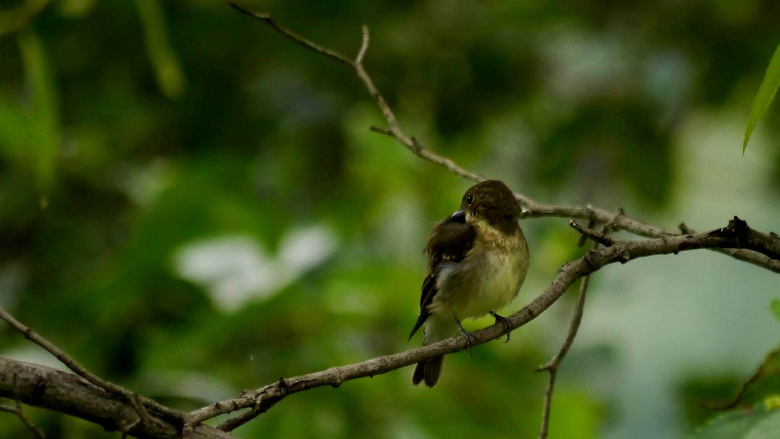 このキビタキのオス若は、翼などがまだらで黒色が混じり、黄色い羽毛はなんとか識別出来ます。でも黄色い眉斑は形すら見えません。前から見るとメスの成鳥と変わりない感じです。
