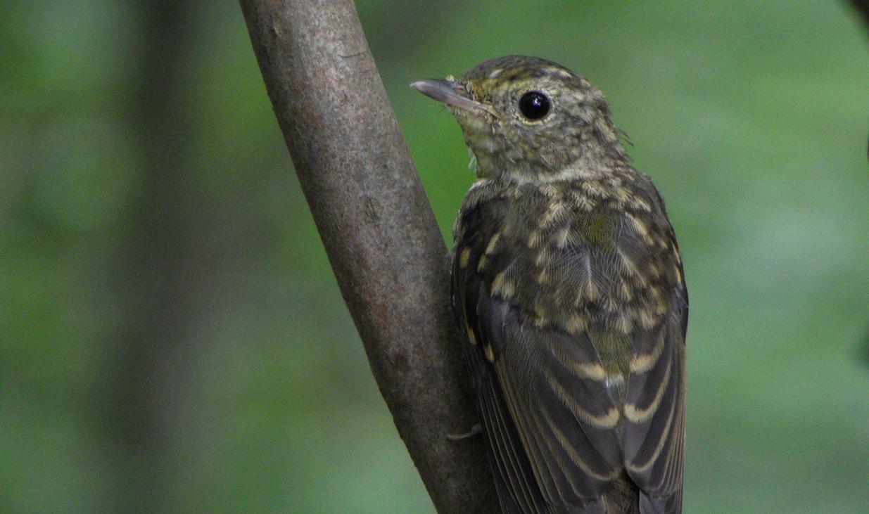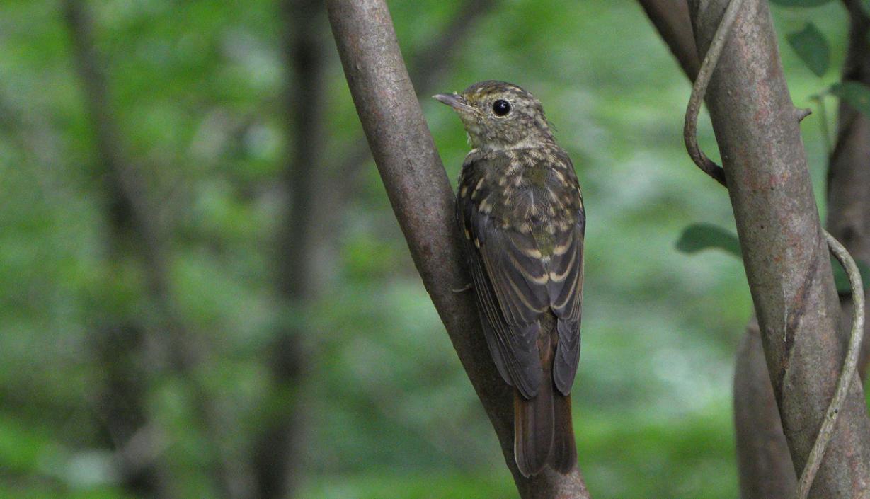 本当はサンコウチョウの水浴びを撮りたいのですが、かなりの難題です。この場所にやってくる雌雄のサンコウチョウ、オスは尻尾が短いです。7月中旬までのオスで、尻尾が短ければ若いオスと判断できるのですが、8月になると長い飾り羽の尻尾は抜け落ちているので、3年以上の成鳥か若いオスかの区別が付かなくなってしまうのです。