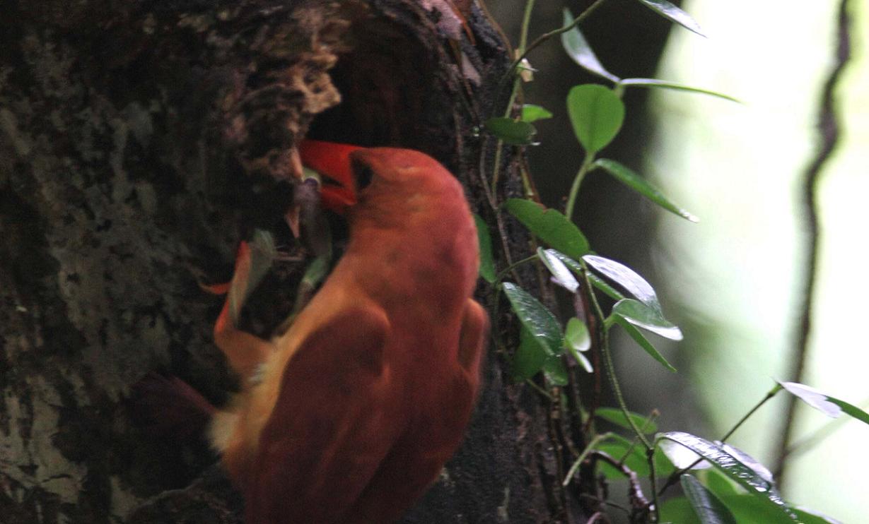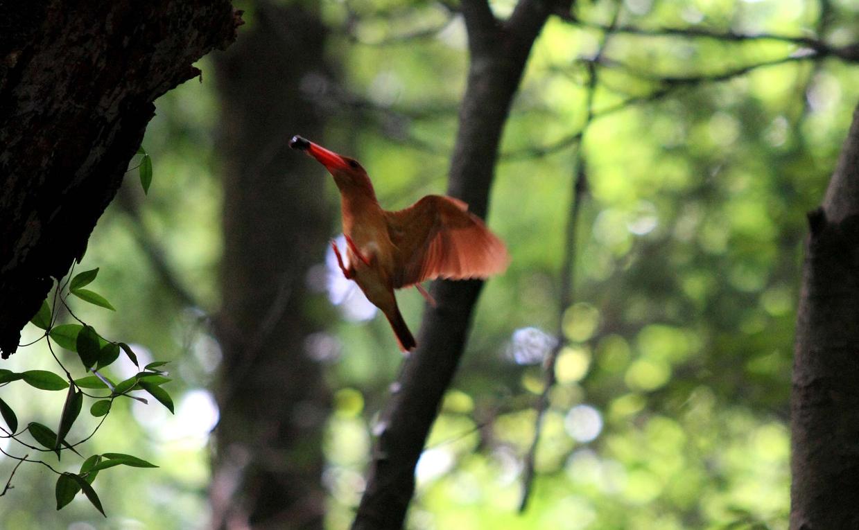 あと一つ、雛が巣立つ時には巣穴の外の風景を見てから巣立つものと思っていましたが、アカショウビンの雛は、頭を出した時点で巣立ってしまいます。4羽の雛の巣立ちを観察していましたが、たじろいだり躊躇する事は有りませんでした。初めて見る緑の森を前に一気の飛翔を行なったのは見事と言うしかありません。