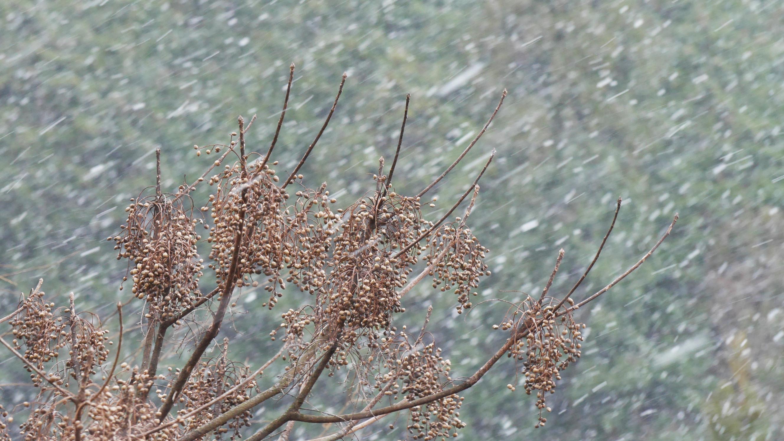 7時頃から9時前まで雪は落ちていませんでしたが、ラジオから流れる情報では大分市内は吹雪が舞っている話しをしています。そのうち県民の森にも雪が落ち始めたので、雪と野鳥のコラボ写真を撮る事にしました。