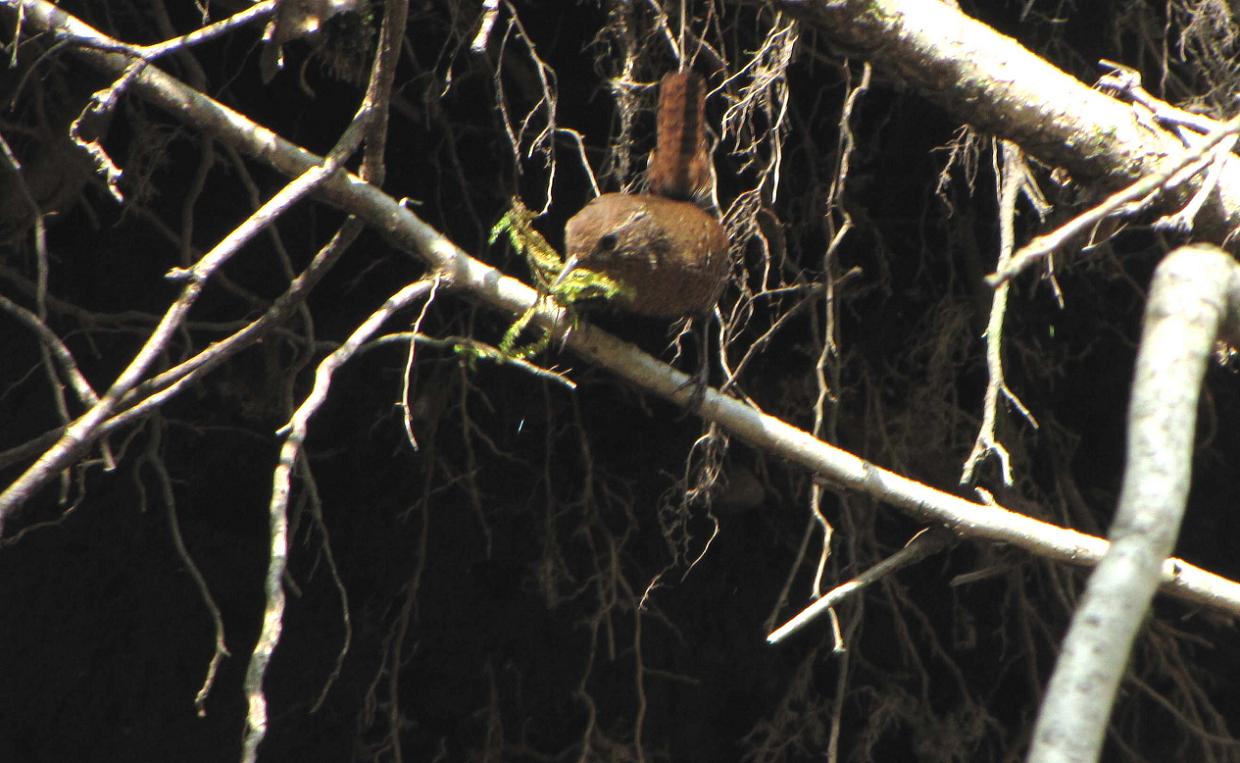 ミソサザイは上から鳴き声が聞こえても、木の中間や梢にはほとんど居ません。岩や地上や崖から3mくらいまでの木の枝や、幹の付近・岩や崖・地上などを鳴きながら移動しているからです。