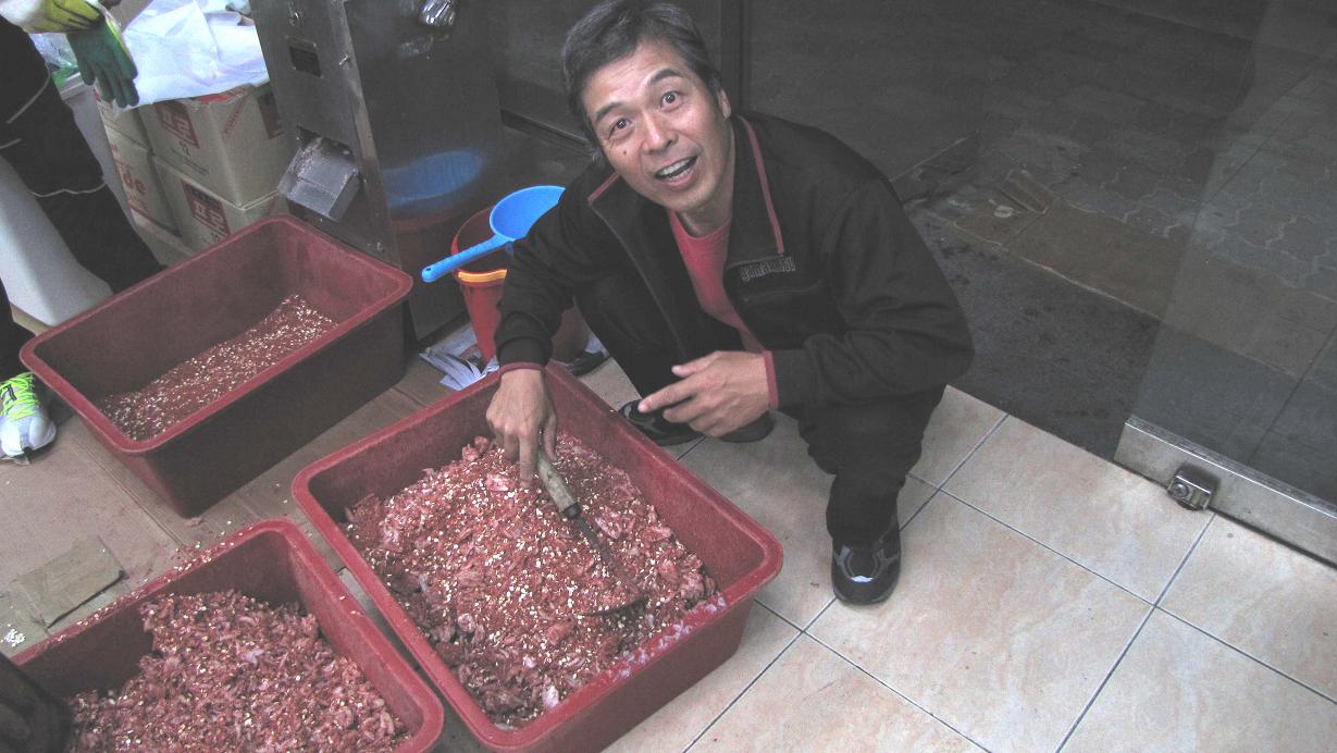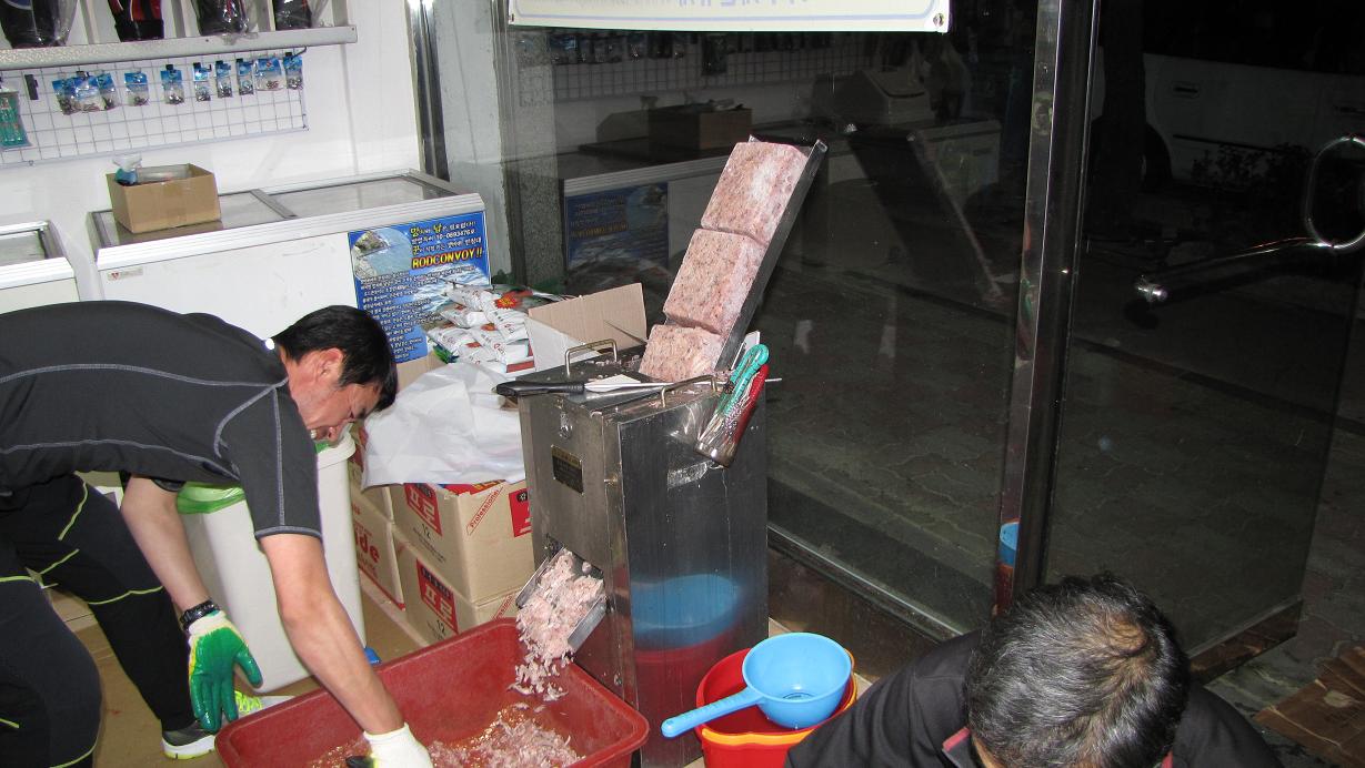 このカンさんのお店でマキエ作りです。オキアミは1.2kgが1角です。これを5つと集魚剤を3袋、それにオシムギを1.5kgくらいを混ぜ、合計10kgくらいになります。2時間の試合が3回あるので3セット作りました。