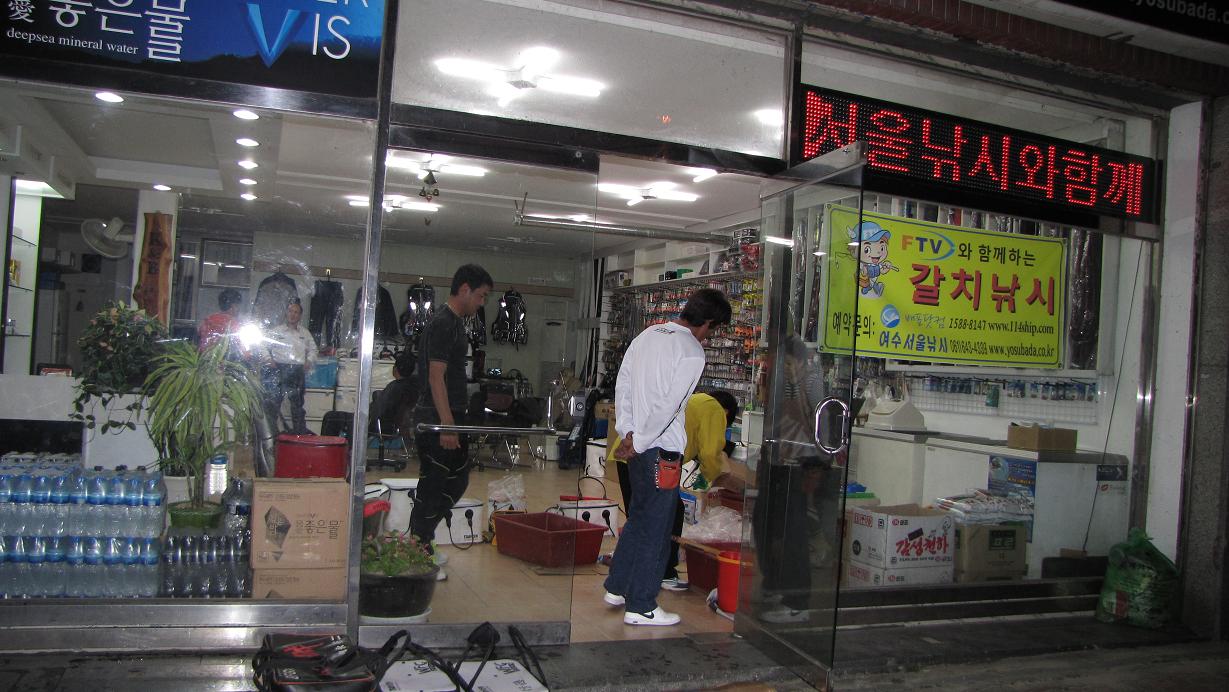 このお店はカンさんの経営する釣具店です。ヨスに行った時には必ずお世話になっている所。カンさんとはWFGの決勝戦の折、五島で戦っています。私の隣でカンさんの遠投釣法が炸裂し、リードされたのを良く覚えています。彼の釣技は本当に怖いほど味わっています。