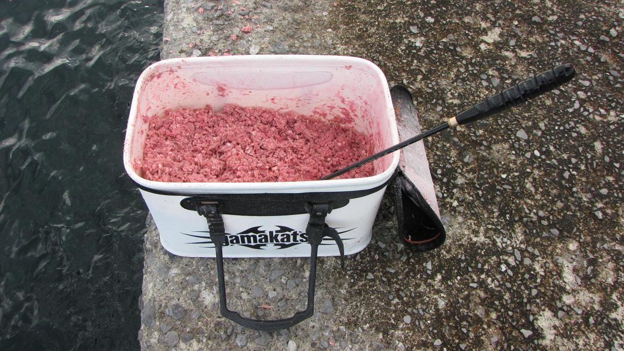 オキアミ生3kg・集魚剤1袋・オシムギ1kgを1時間で撒き込みます