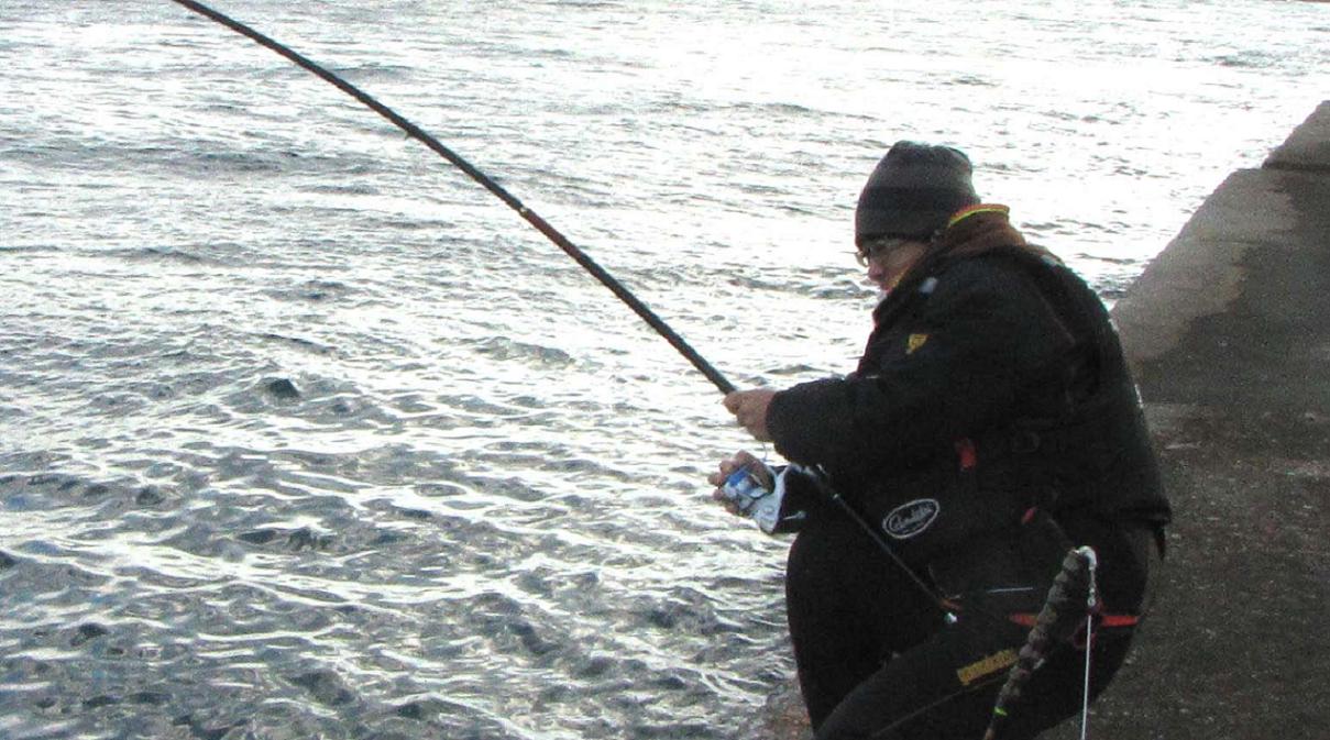 でも一時は風が強くなり、時々後ろから波飛沫を浴び始めました。フードを置いてきたので、替わりに36cmのバッカンを頭から被って我慢の釣りが一時間ほど・・・
