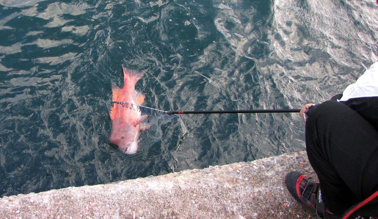 多めにマキエを打ちながら、1分以上経って完全フカセの仕掛けを岸壁の際に入れます。ウキ止め糸があと70cmくらいでウキに到達する15時26分、道糸がスルスルッと走り出しました。完璧なアワセに浮いてきたのは、フカセカンダイとしては中学生クラス?の目測2,5kg級でした。