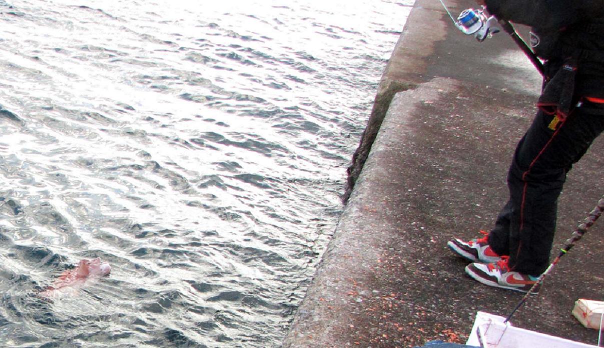 小型カンダイを釣った後、再び狙います。多目のマキエ、20cm級の太いアオイソメを3匹、ハリにチョン掛けです。3匹のアオイソメはうねうねしながら、岸壁の際30cmくらいの所をマキエを追って沈んでいきます。