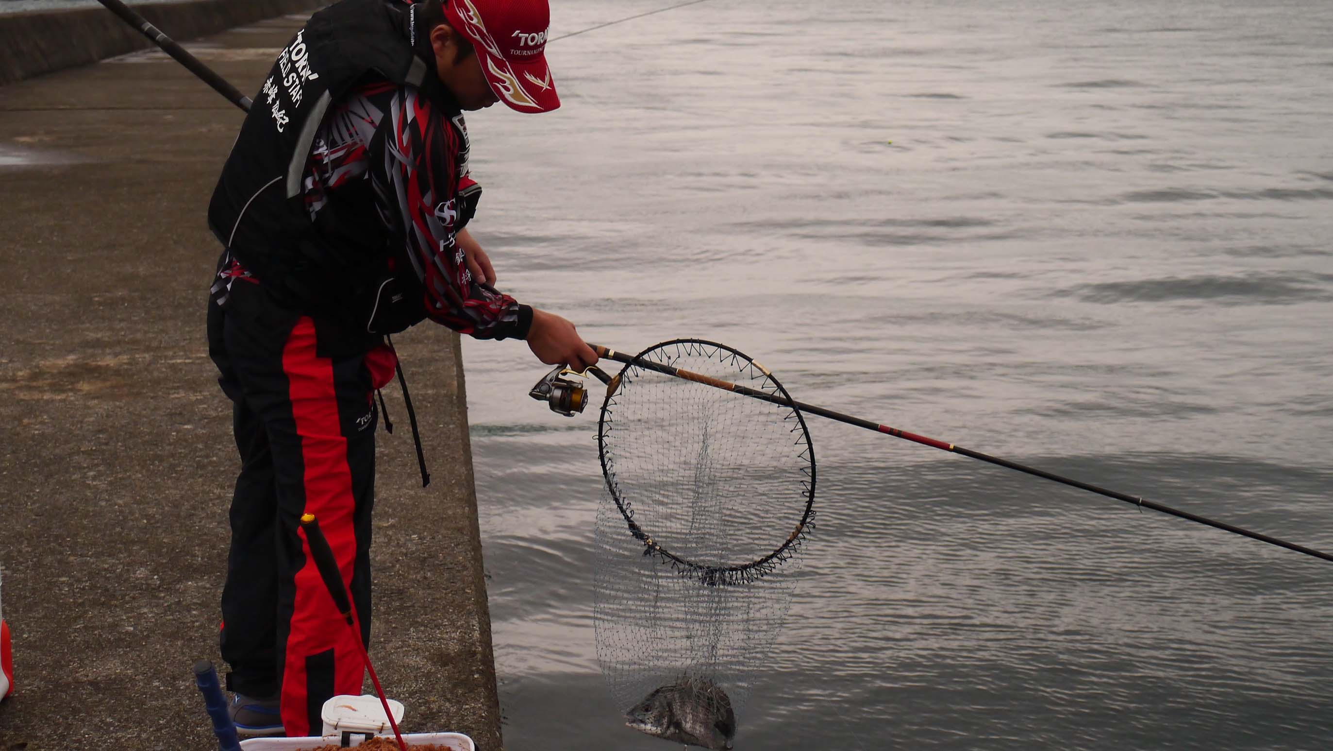 グレやチヌを狙う場合のタモ枠は口径40㎝・タモ網は深さ50㎝よりも40㎝の方がもっと良い。これなら80㎝以下の魚は全て掬えます。実際の最大魚はマダイの86㎝で、ウネリの為一回失敗しましたが、磯釣りで掬った経験があるからです。