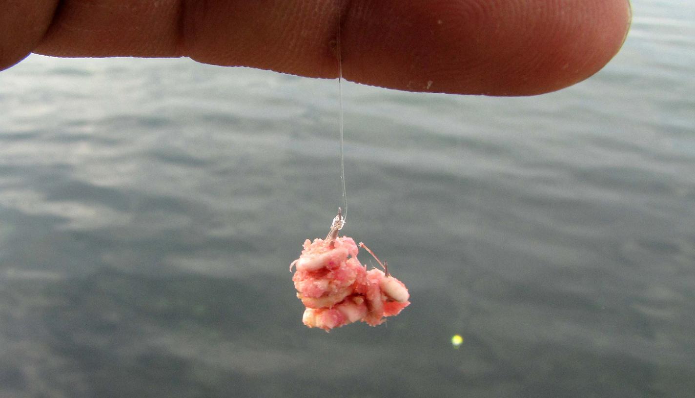 この後の夕方からアジゴが沢山来た様で、オキアミのサシエでは直ぐにアジゴが掛かってしまいます。そこで、写真の様にマキエの中の押しムギを5~6個ほどハリに刺し、アジゴを交わしながら釣り続けます。