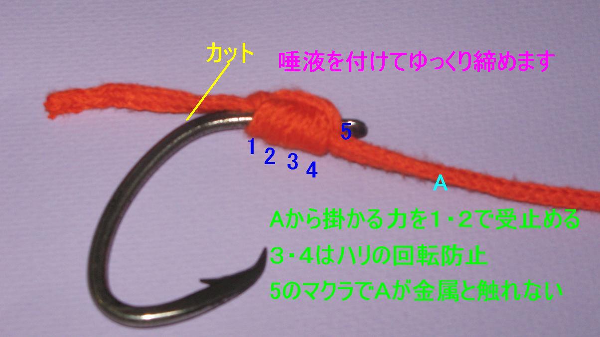 締め込みは唾液をつけて、支線と本線をゆっくりと引っ張りましょう。本線は1と2の巻きを締めています。支線は4と5の巻きを締めています。本線と支線の力が届かずに、締まり難いのが3の巻きです。この後でハリと本線で引き合い、更に締め込むと完璧です。ノットガードVを併用すれば更に強い仕掛けが完成します。