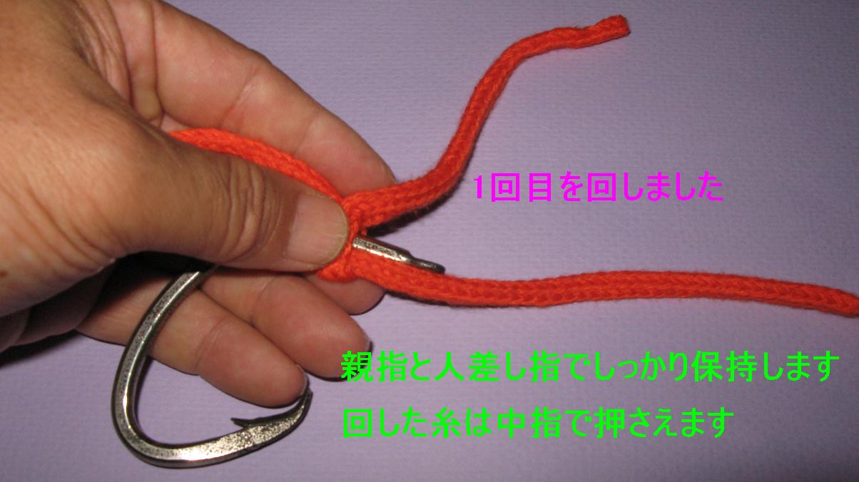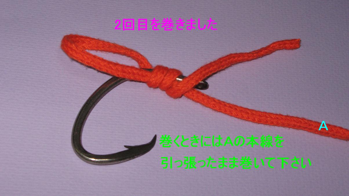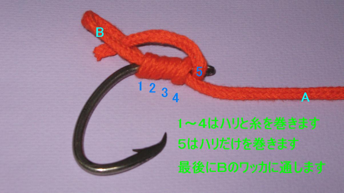 ハリ結びは何回回す?などと言う質問は、ほとんどが外掛け結びか内掛け結びの場合が多い様です。私は“変形縄船結び”と“外掛け結び”を使い分けていますが、ここではポピュラーな“外掛けマクラ結び”を説明します。