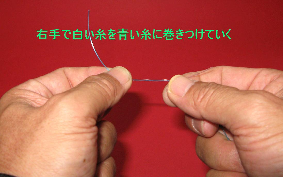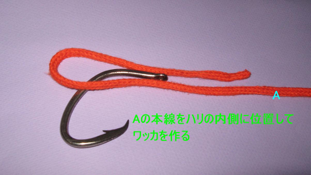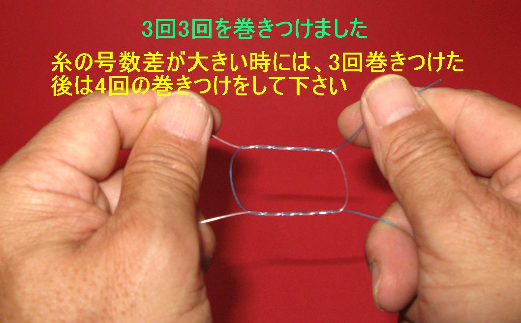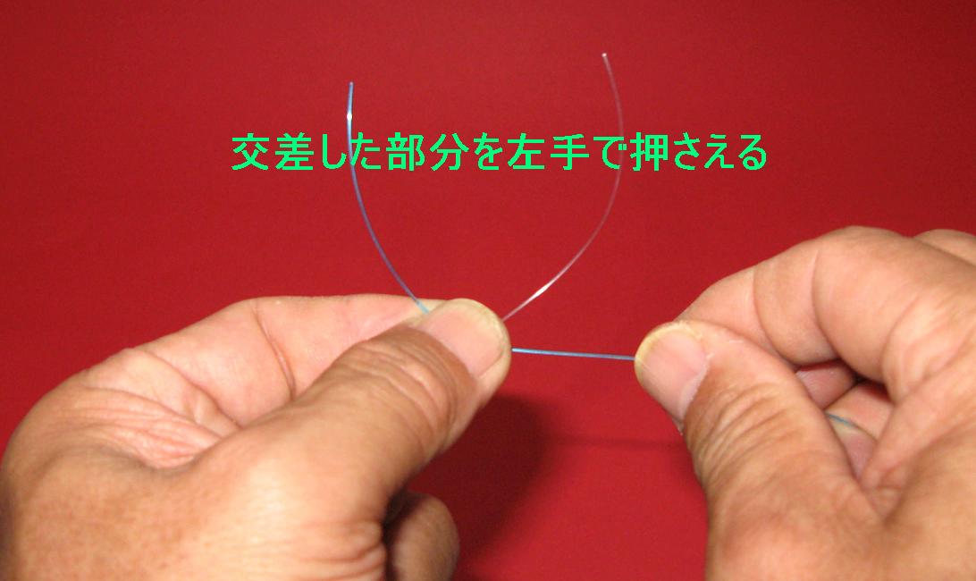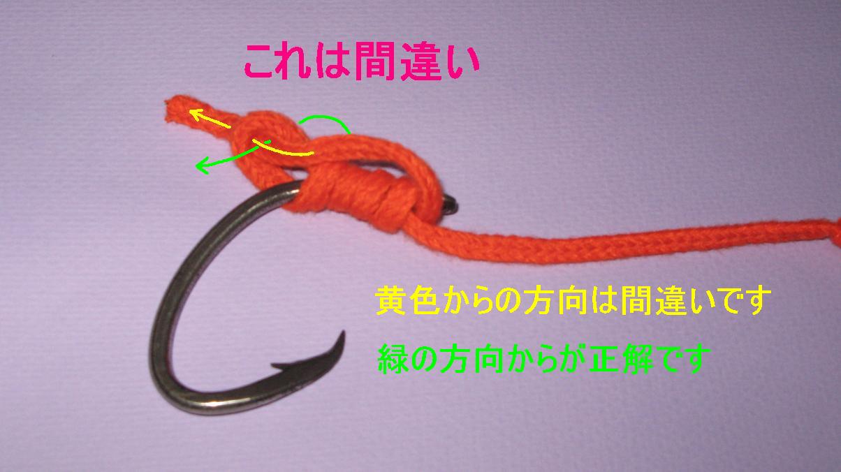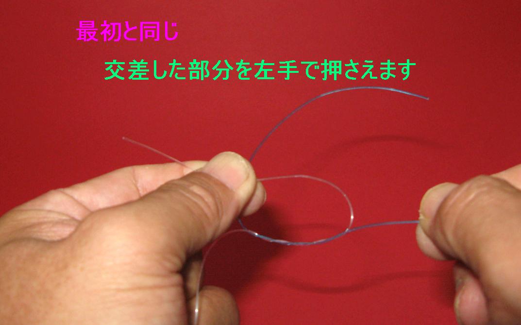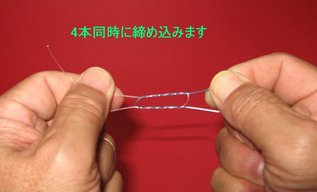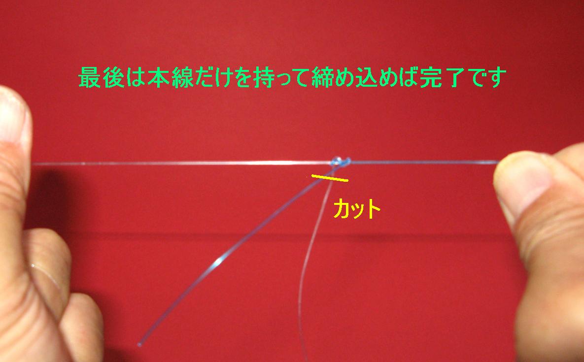 私の直結方法はストロングノットです。1000釣法はハリスを約10mほど使います。だから糸を結ぶ時に、糸をワッカの中を通すやり方は行ないません。