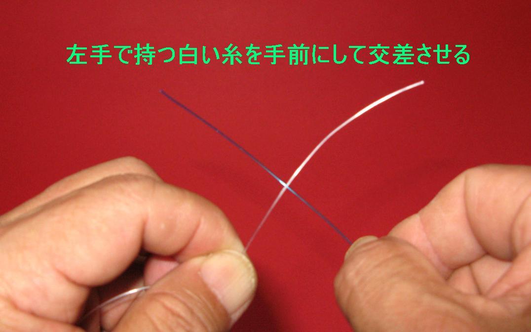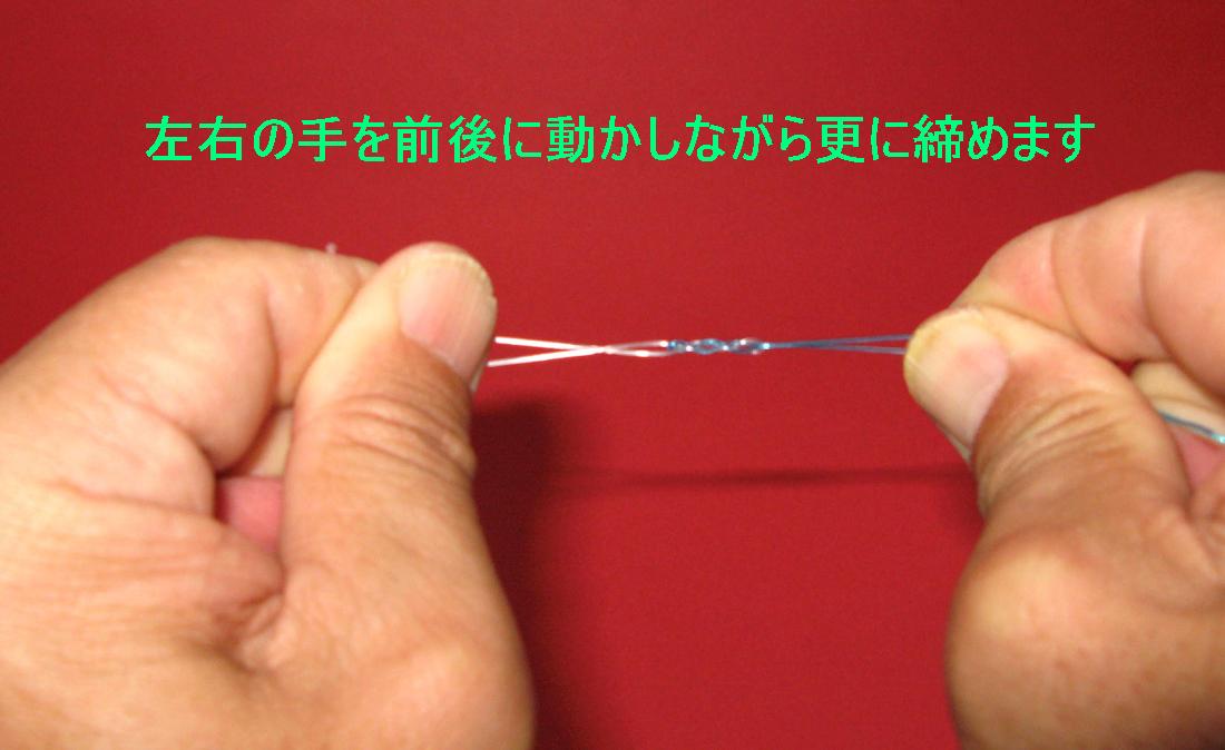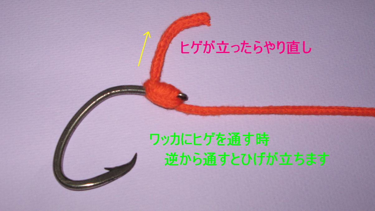 大切な事は、本線を常に張ったまま作業をすることです。“変形縄船結び”は本線を張らなくても作業は出来ますが、外掛けや内掛けはウキの重量を利用して作業をしましょう。