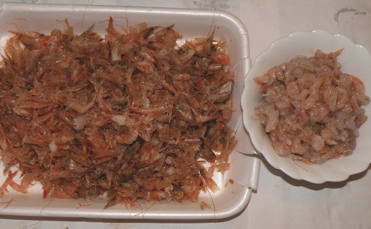 鮮魚店でエビを購入します。小エビ・アカエビ・シバエビなどの名前です。これを購入して一匹ずつ皮を剥くのです。