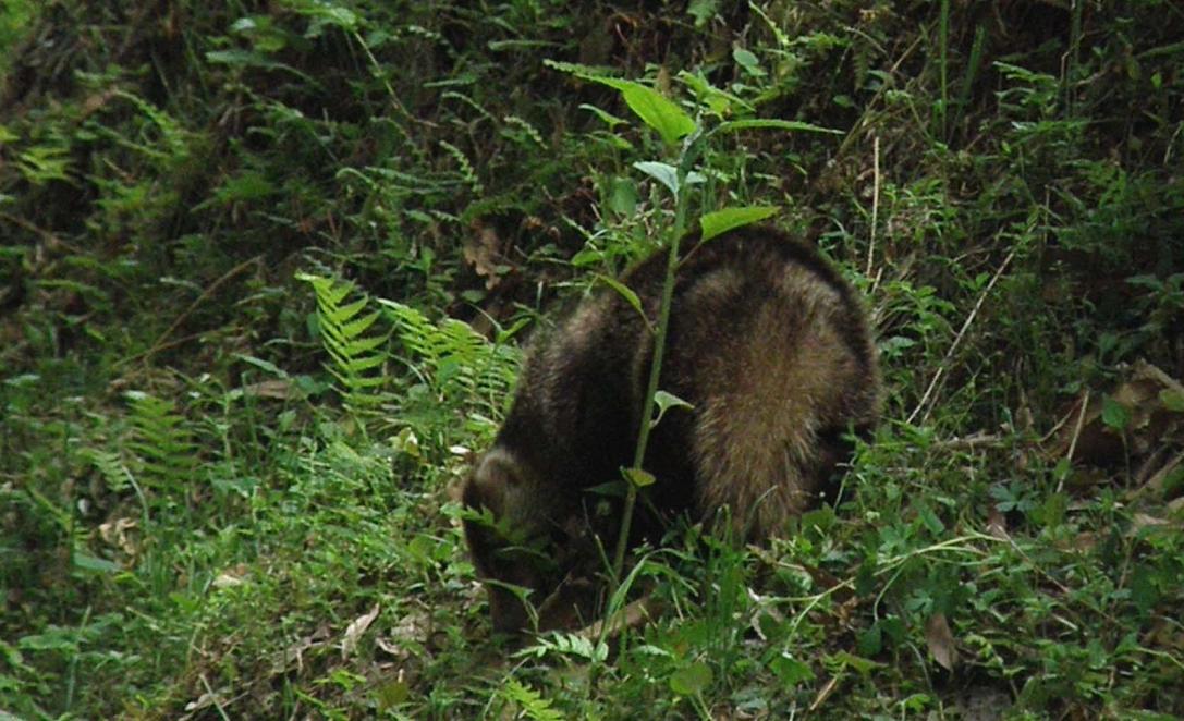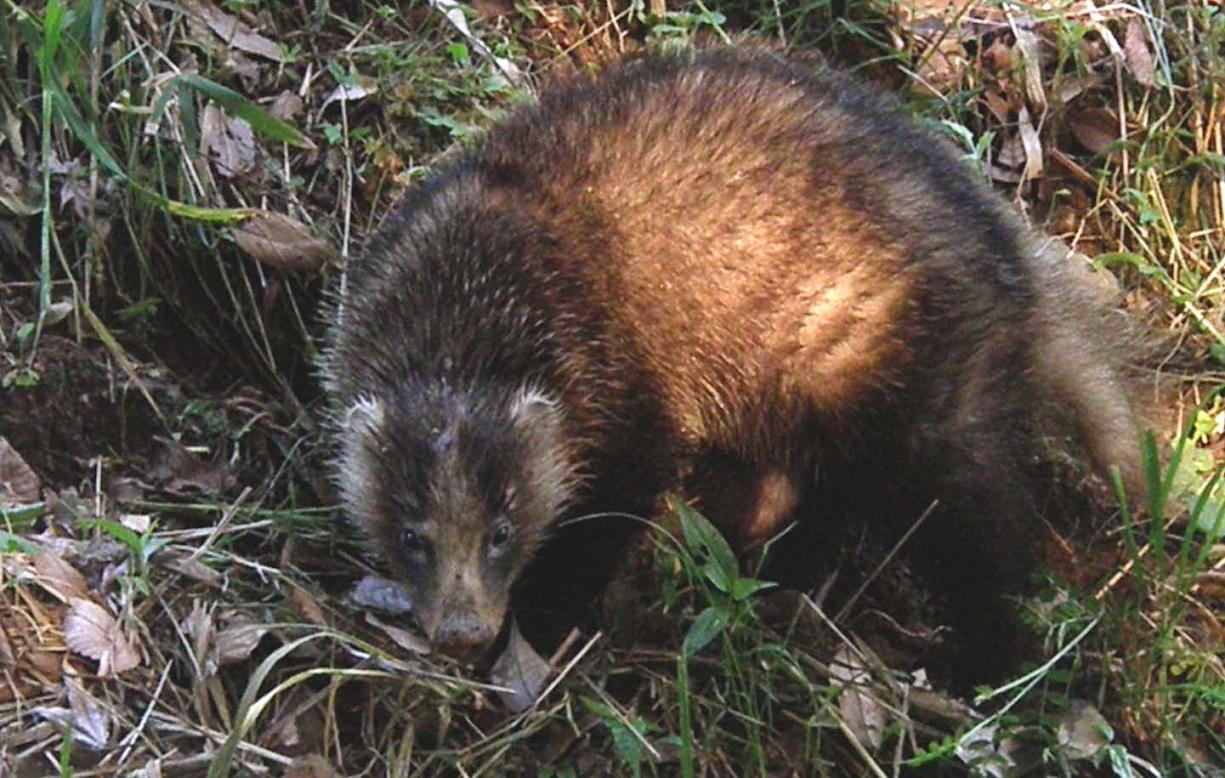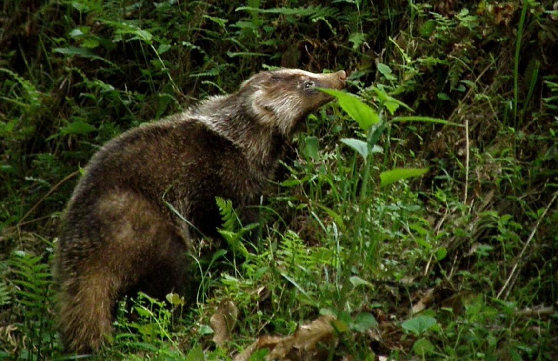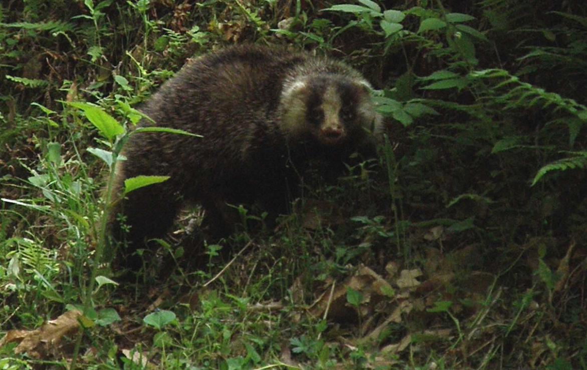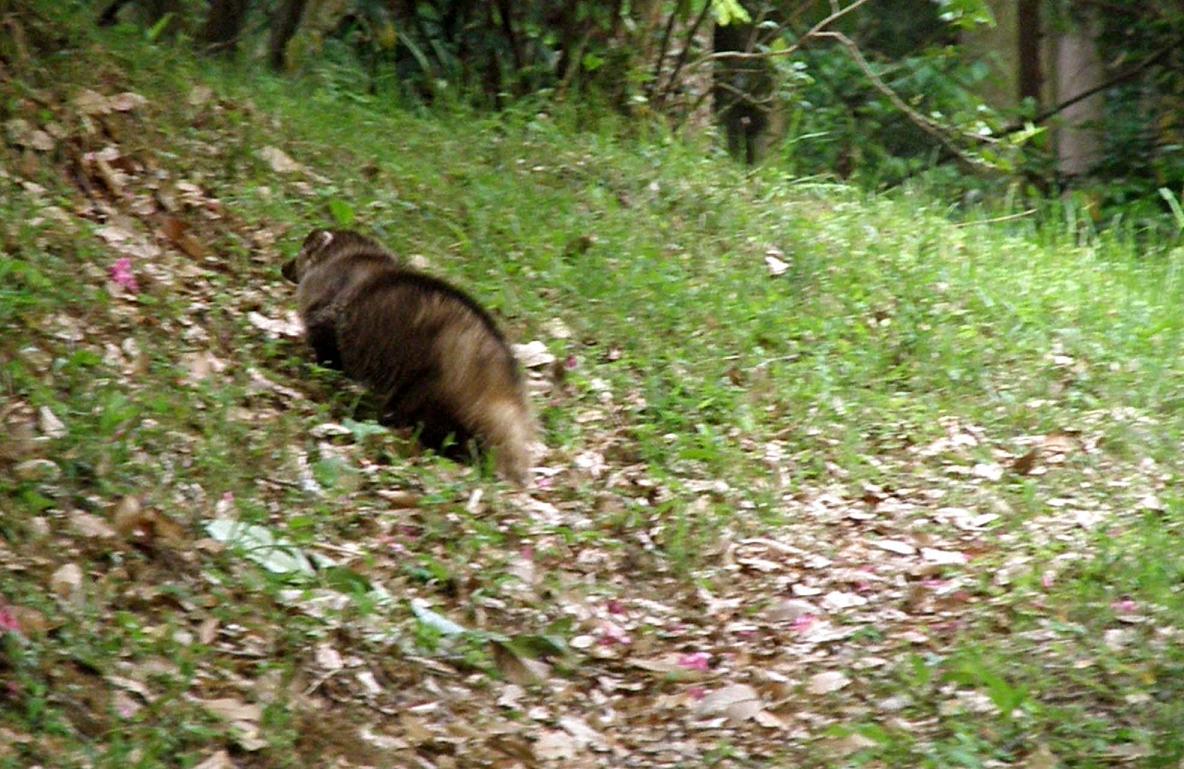 フ~~~フ~~~・・・と変な鳴き声が傍からしたのです。3mくらいの所にタヌキみたいな、アライグマみたいな動物が居て、盛んに威嚇の声をあげているのです。