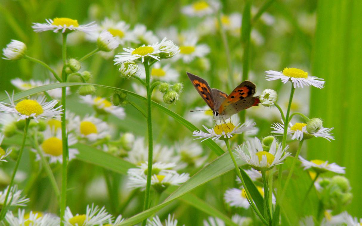 今、河原や空き地などにたくさんの白い花が咲いています。ヒメジオンです。花が咲くと、やってくるのが色々な虫達です。