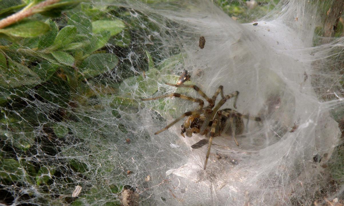 私はこの蜘蛛を取って小鳥のエサに良く使っていました。取り方はトンネルにいる蜘蛛を、上下から手で叩き合わせて、巣毎取ってしまう荒業。蜘蛛が潰れない様に、手の平に空間を空けるのがコツです。
