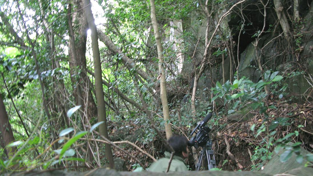 アカヒゲ探索で5時前にカメラマンと供に山に入り、以前鳴いていた崖の所まで一気に登る。アカヒゲと思しき鳥は、すでに鳴き始めていたので気付かれない様に・・・