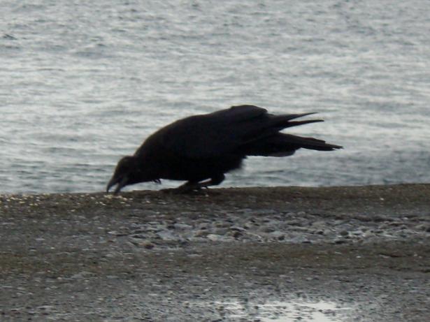 このカラスも頭を横にしてオキアミを喰っていた。シャッターが・・