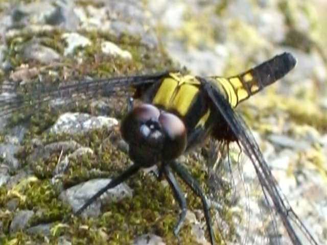 実家の墓参りに行った時に見つけたトンボ。体付きや飛び方・同じ場所に戻って来るなど、シオカラトンボに似ているものの黄色がヤケに鮮やかだった。