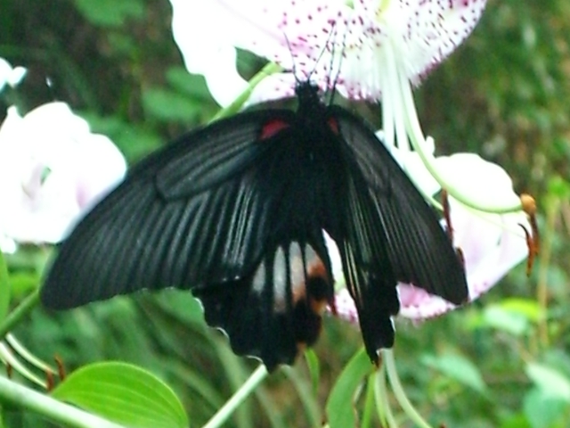 図鑑などは背中側からの絵が多く、羽の裏側を撮った絵が少ない。腹側の赤い色を考えず、背中側からの絵だけを見たら、羽の基部にある赤い模様と、後ろ羽の先に尾がない ことから、ナガサキアゲハの♀と判断する事が出来る。