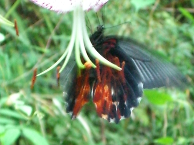 近くには山百合がかなり沢山ある訳ね、ず~っとその花を巡っているとどーなるか?花粉が羽の裏側の白い模様の部分にくっついて赤くなった!と判断したけど・・・本当のところどーなんじゃろか?
