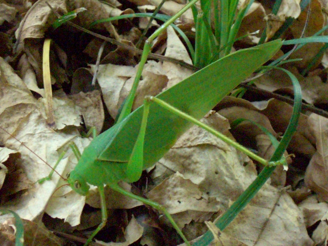 夜、明かりに集まって来る虫達で、緑色の綺麗な虫が一匹ポツンと混じっている。子供の頃はウマオイ(すいっちょん)だと思っていたけど、ツユムシであった。