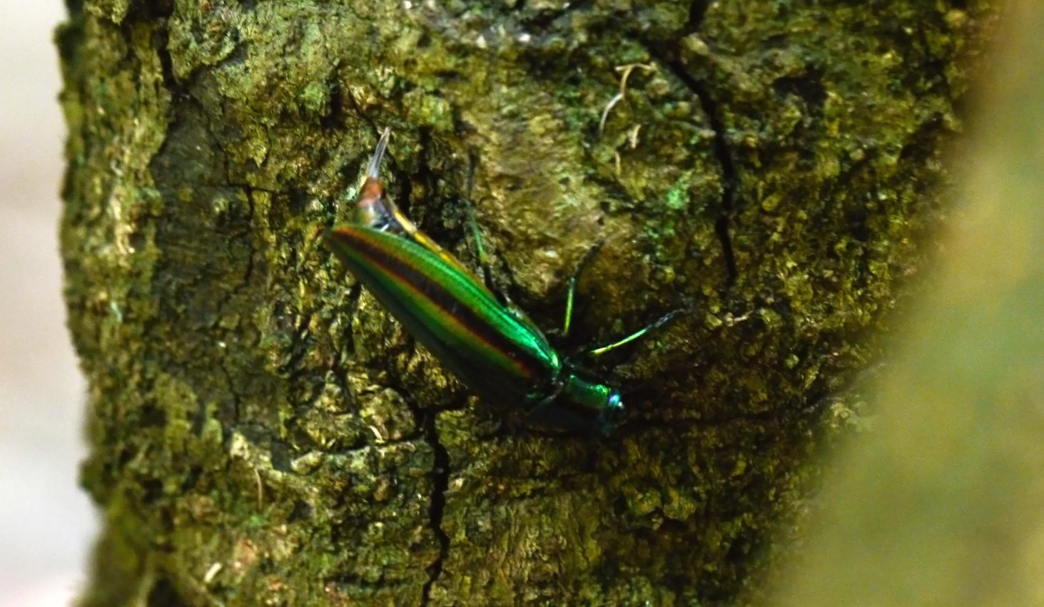 立ち枯れの樫の木で、美しい虫がなにやら一生懸命に動き回っています。