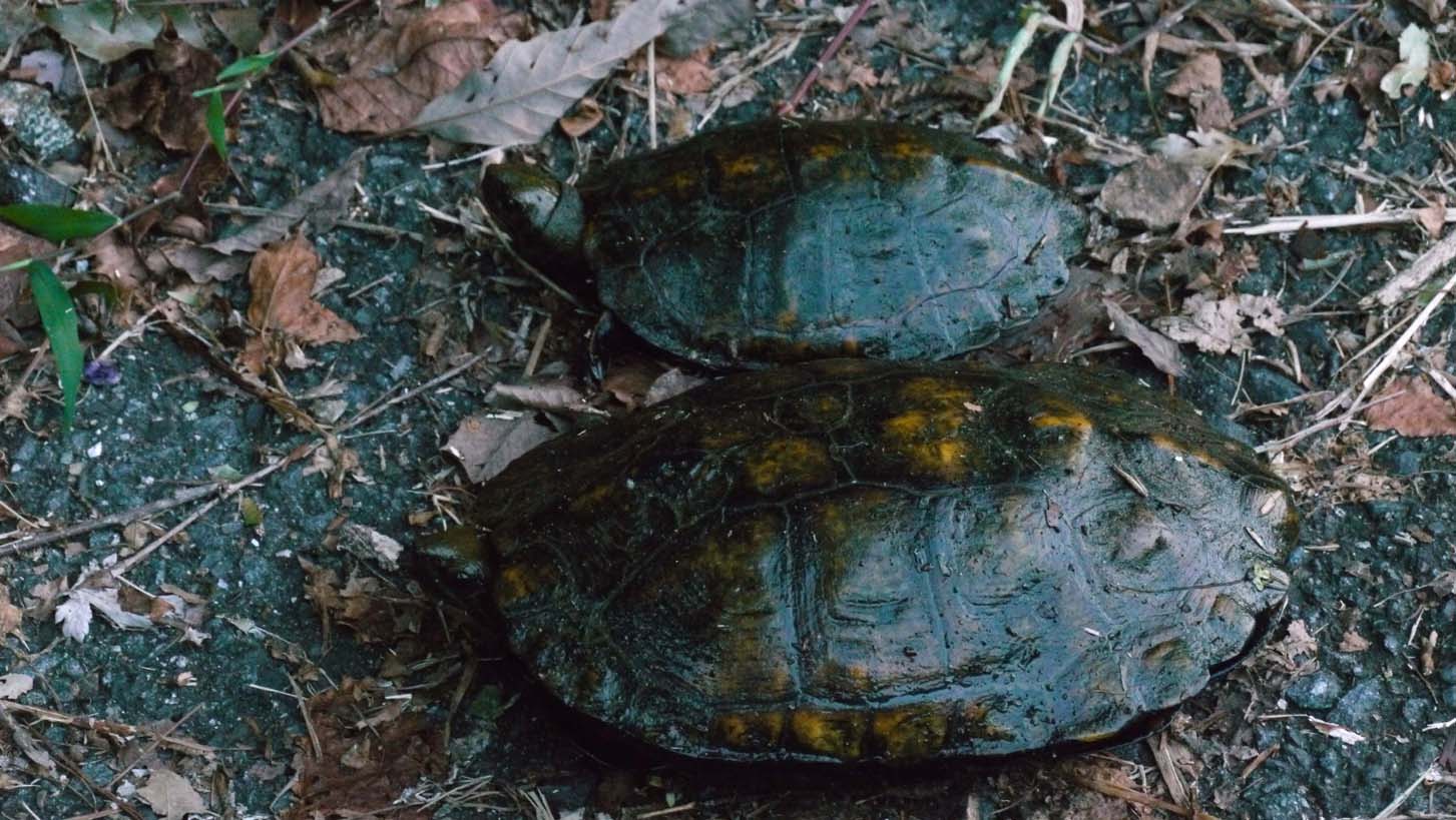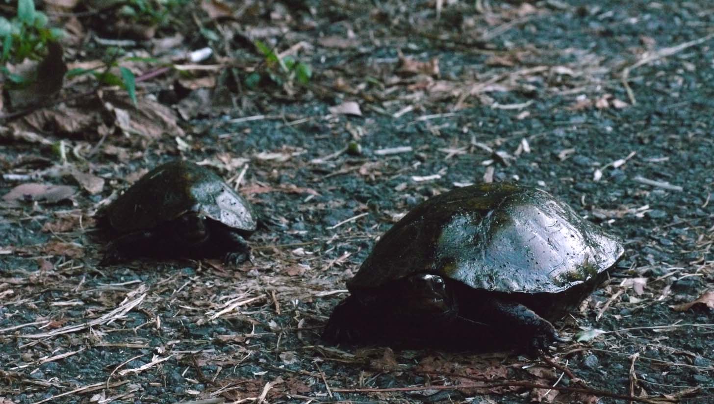 山道を2匹の亀が早朝ウオーキング。