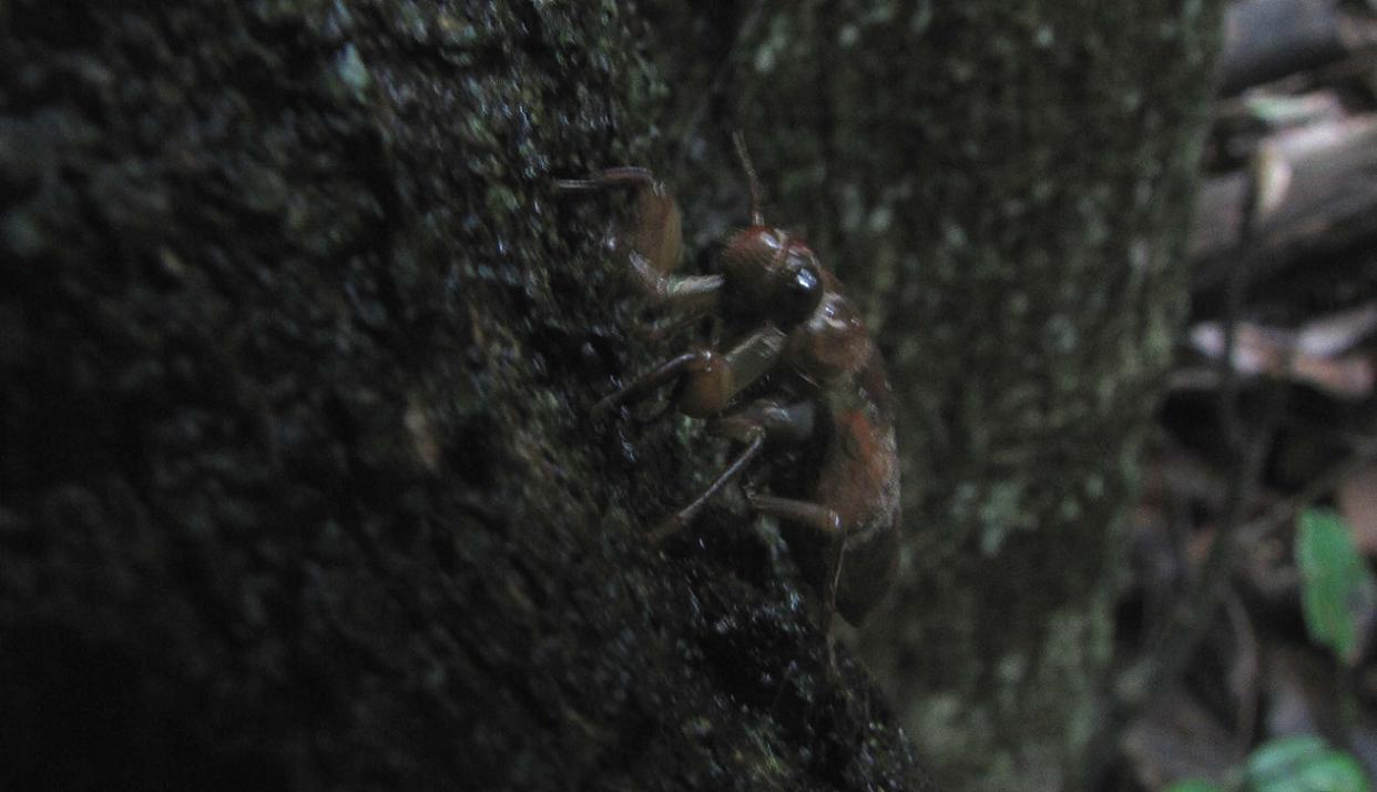 昼過ぎ、一匹のセミの幼虫が木に登り始めました。