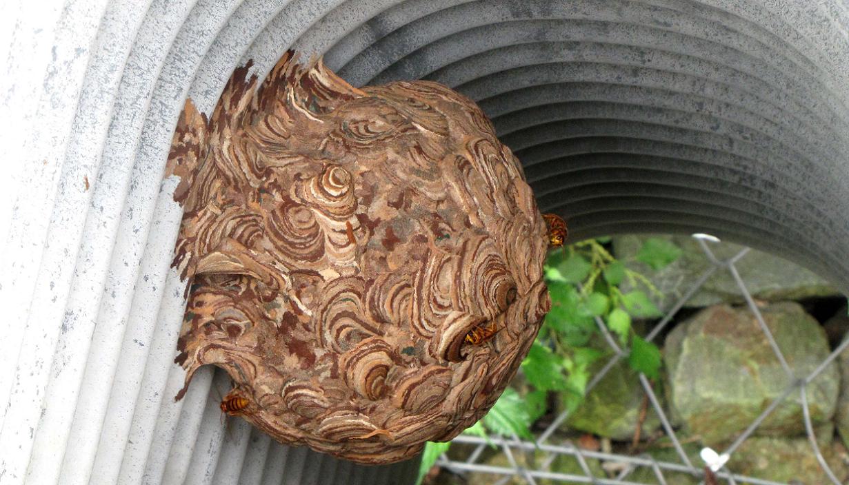 昨日刺されたキイロスズメバチの巣は、山道脇の排水溝の水を受ける樋の中にあります。昨年はこの中に巣を作っていなかったので、ココでの繁殖が上手くいけば、来年もココに営巣すると思います。