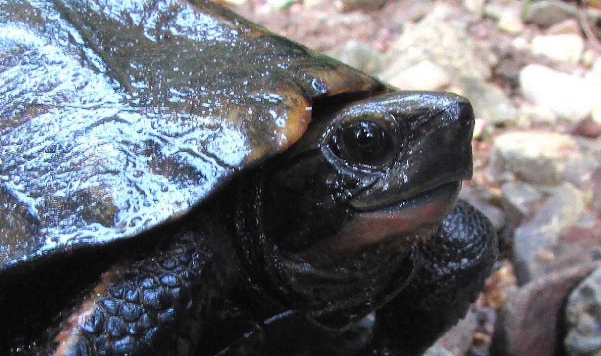 このカメは、その上流にあるキャンプ場の横を流れる渓流にいました。甲羅の全長は18cmくらいで大人です。尻尾の太さを見ての雌雄の識別は、残念ながら考えが及びませんでした。