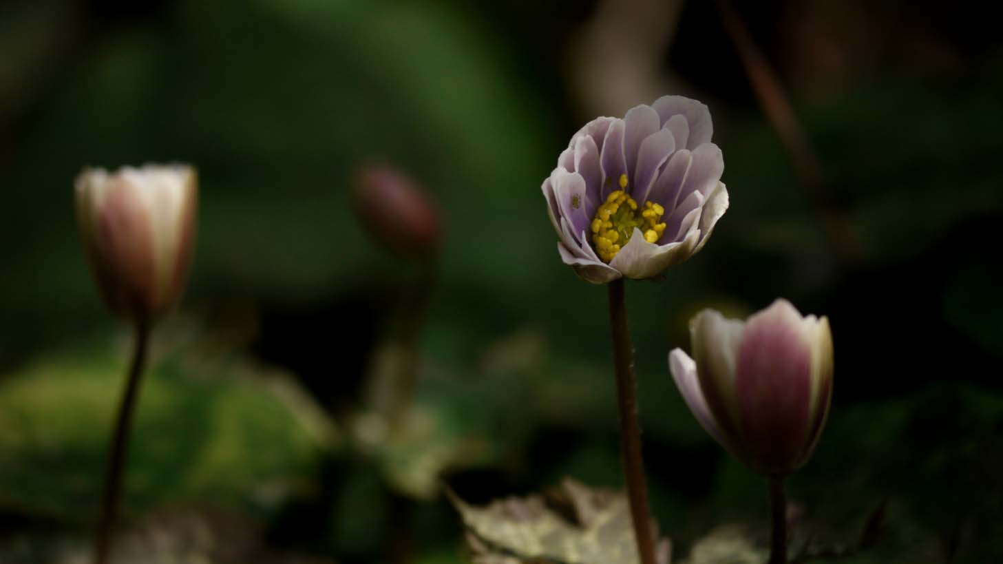 ユキワリイチゲは、群生地の奥の方でようやく3分咲き。