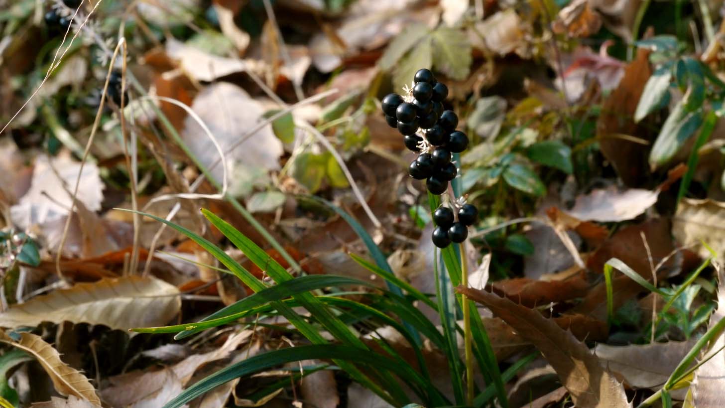 同じ様な葉っぱで沢山集合して、紺の実を付けるのはジャノヒゲ。