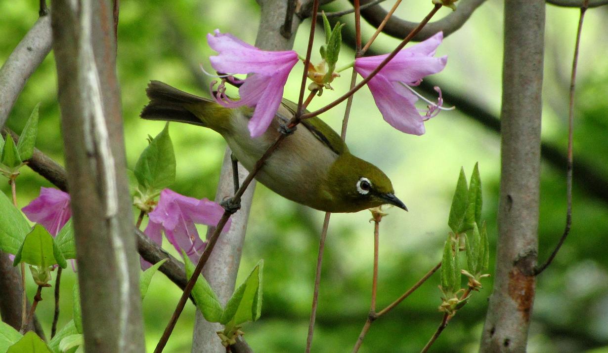 3月に咲き始めるミツバツツジと、蜜を吸いに来たオスのメジロ