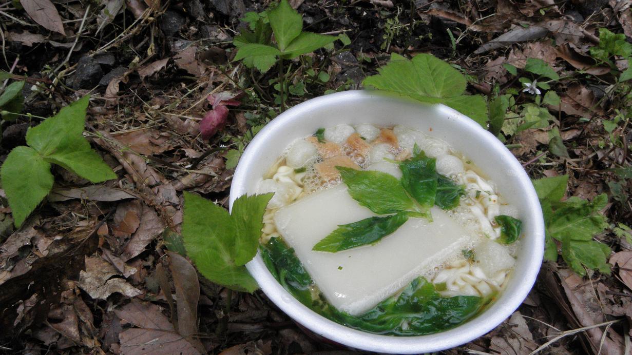 基地に置いていた半年前のカップ麺(力うどん)を食べました。