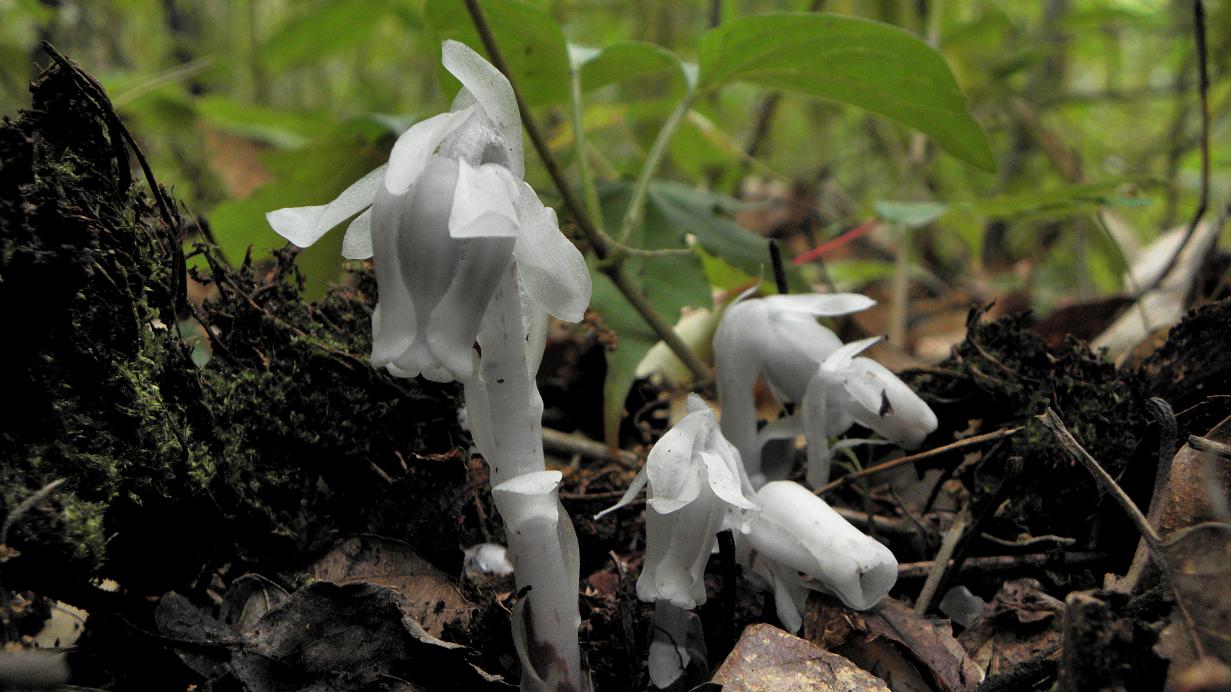 小さな幽霊が薄暗い林床にポツンポツンと咲いています。