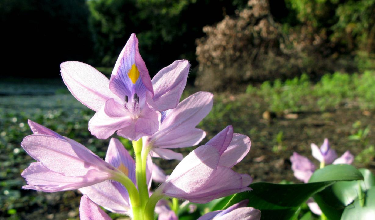 水草の仲間、ホテイアオイの花が今を盛りに咲いています。