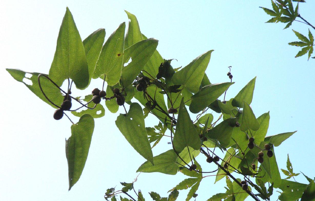 自然薯(ヤマノイモ)のムカゴです。逆光で見難いのですが、まだ青味が強く食べごろではありません。