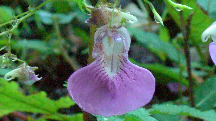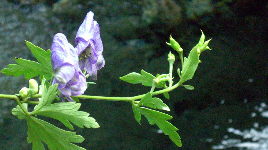 谷川沿いの、あまり日当たりの良くない所で群生して咲いている。紫の花で袋状になっており、かなり目立っている。