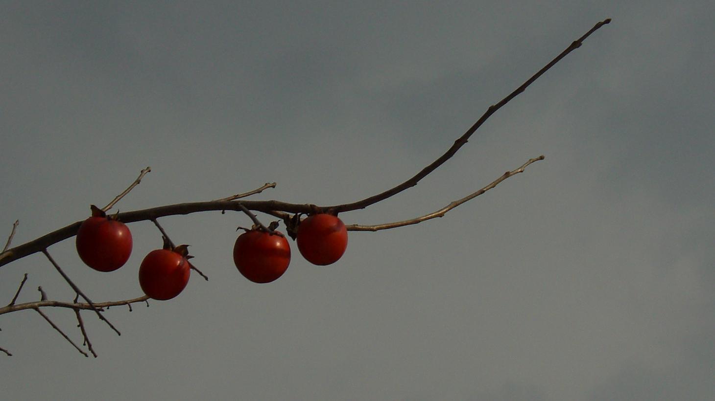 コレに葉っぱが一枚くっついていて、空が青かったら完璧だったけど、柿の木としては、メジロやヒヨドリに喰われる前に撮って欲しかった様な・・(^^♪