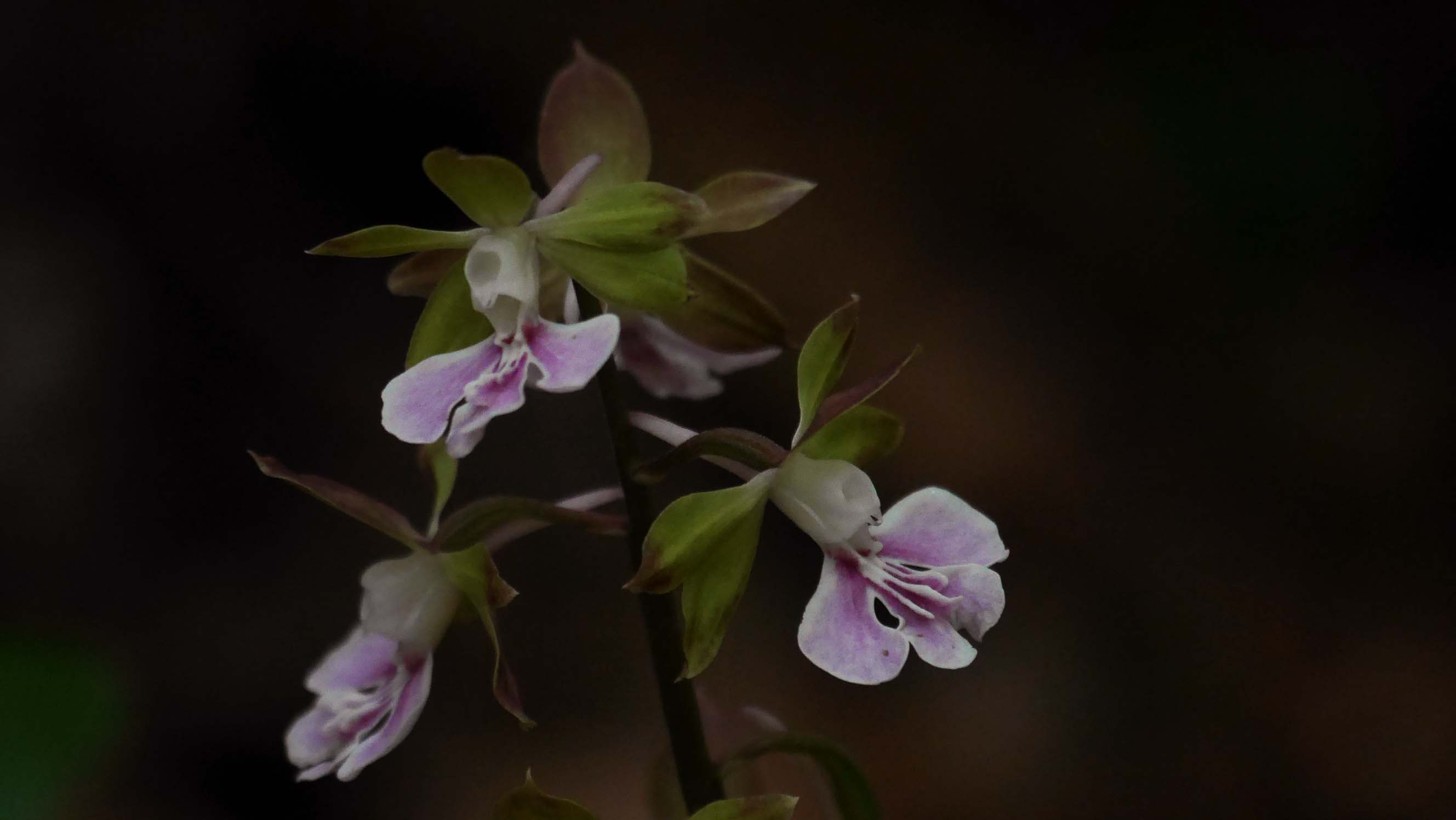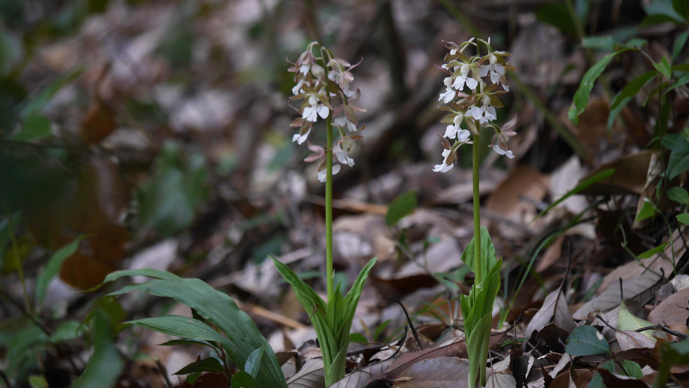 杉の林間に咲いているエビネ。