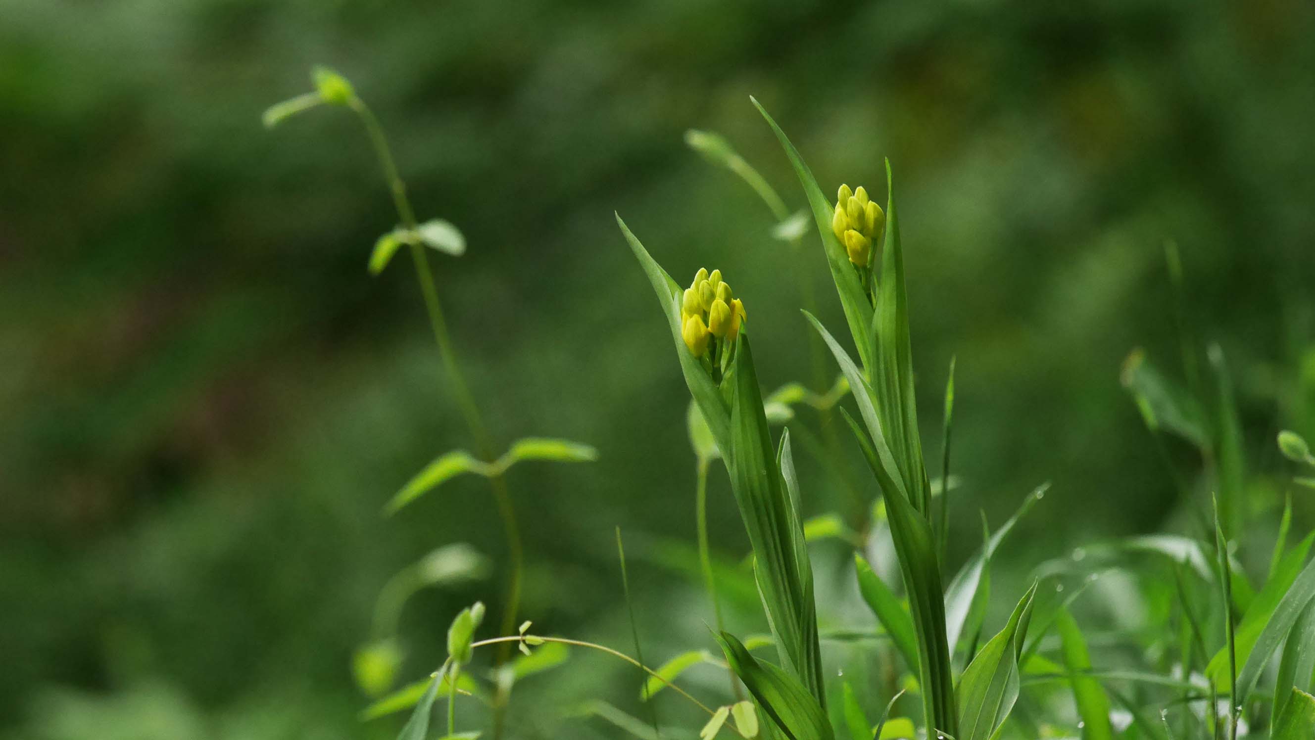 すると、いつもの場所のキンランが少しだけ咲いています。この場所だけでも6株のキンランがあり、撮影をしていると、谷の方からサンコウチョウの鳴き声が聞こえ始めました。・・・何とも言えない至福の時間を独り占めです。