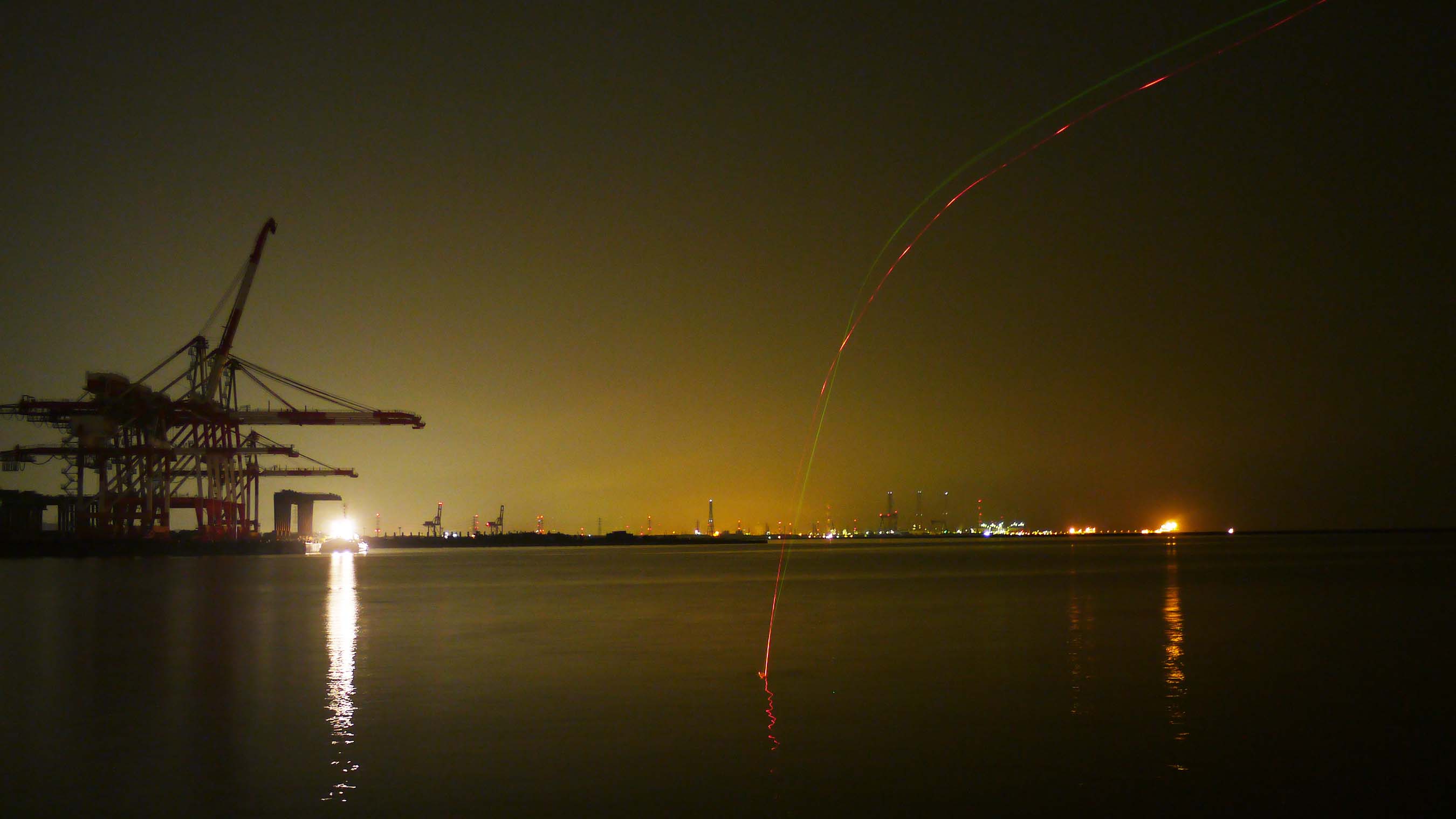 ② 街中の海で夜釣りをする時には赤や緑や白色など、いろんな色が海面に反射しています。特に白い色が多いのですが、現場で見やすい色の電気ウキを使って下さい。私的には、街中で使う色は赤色が多いです。